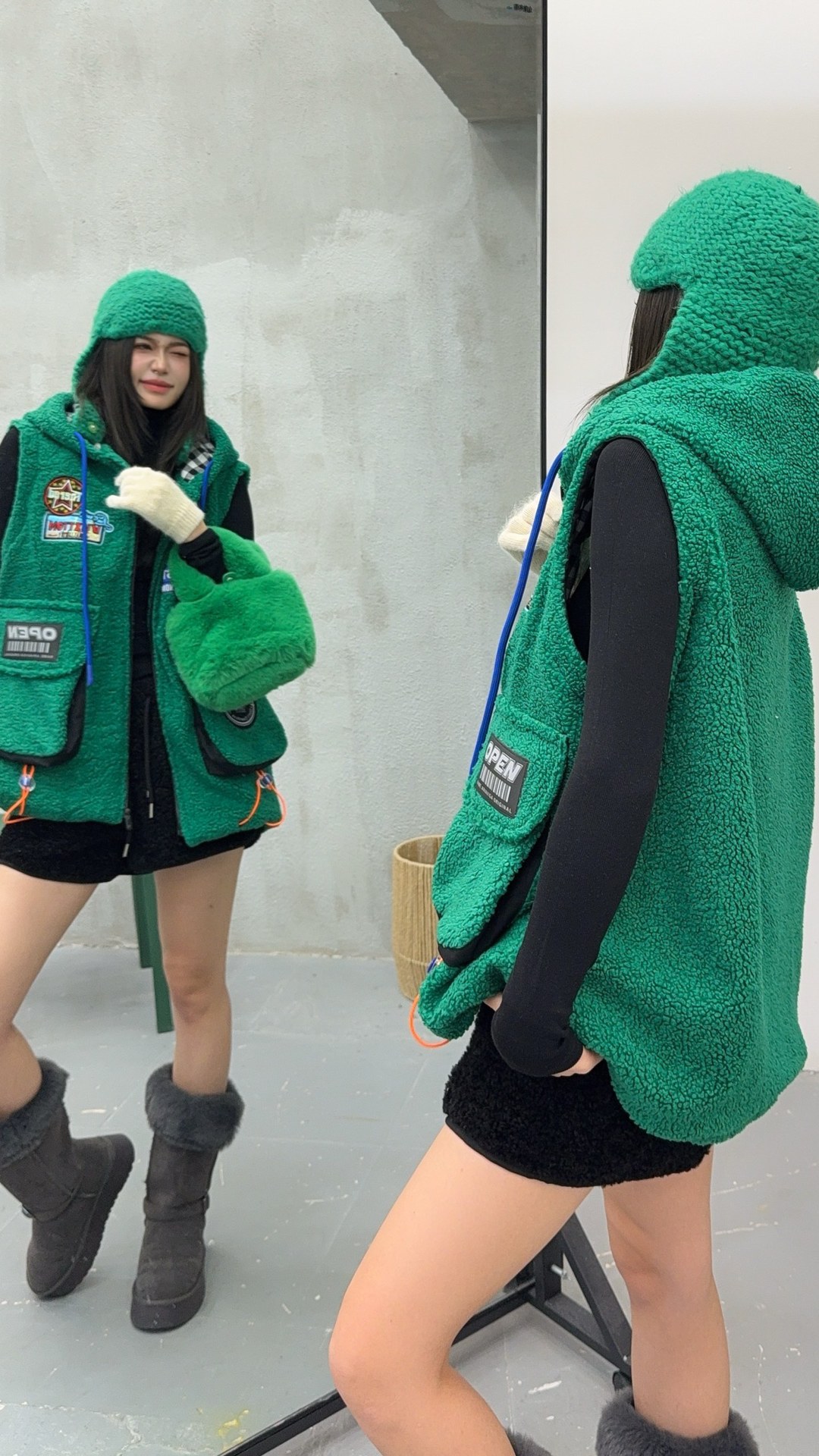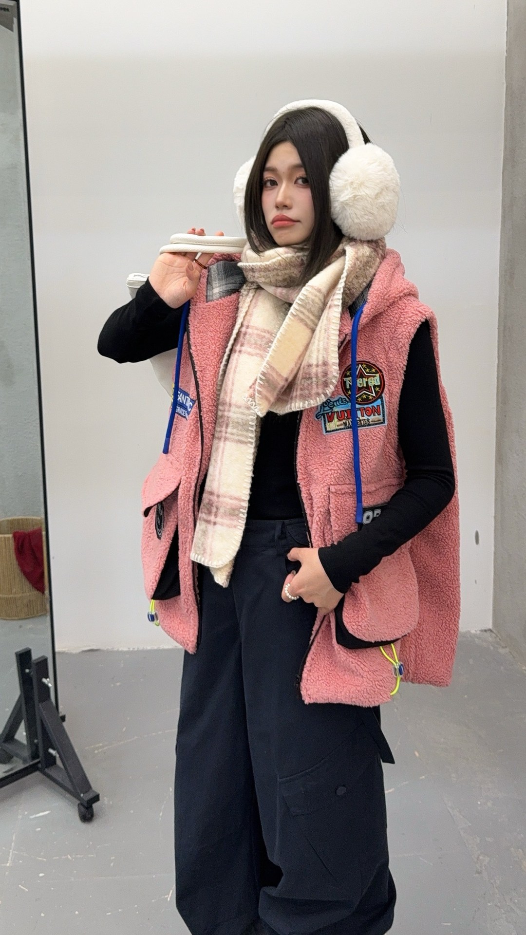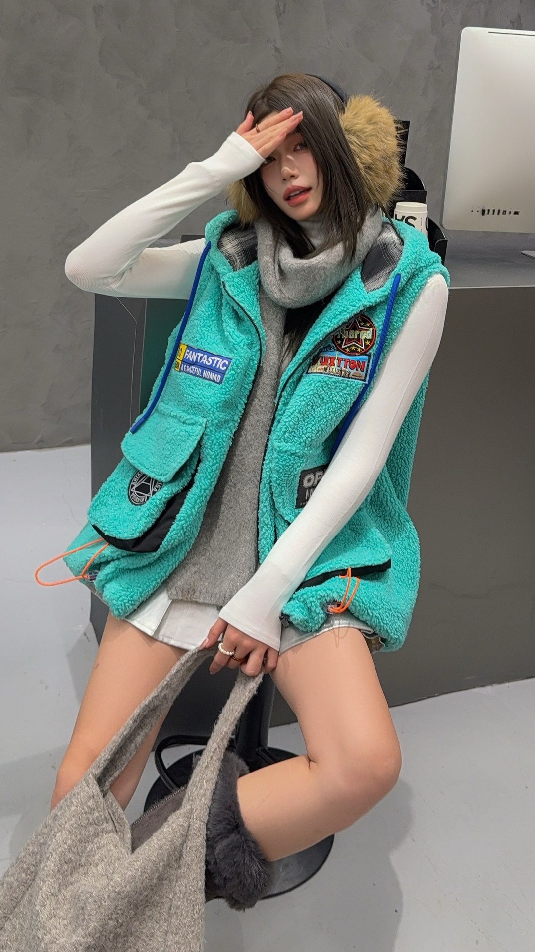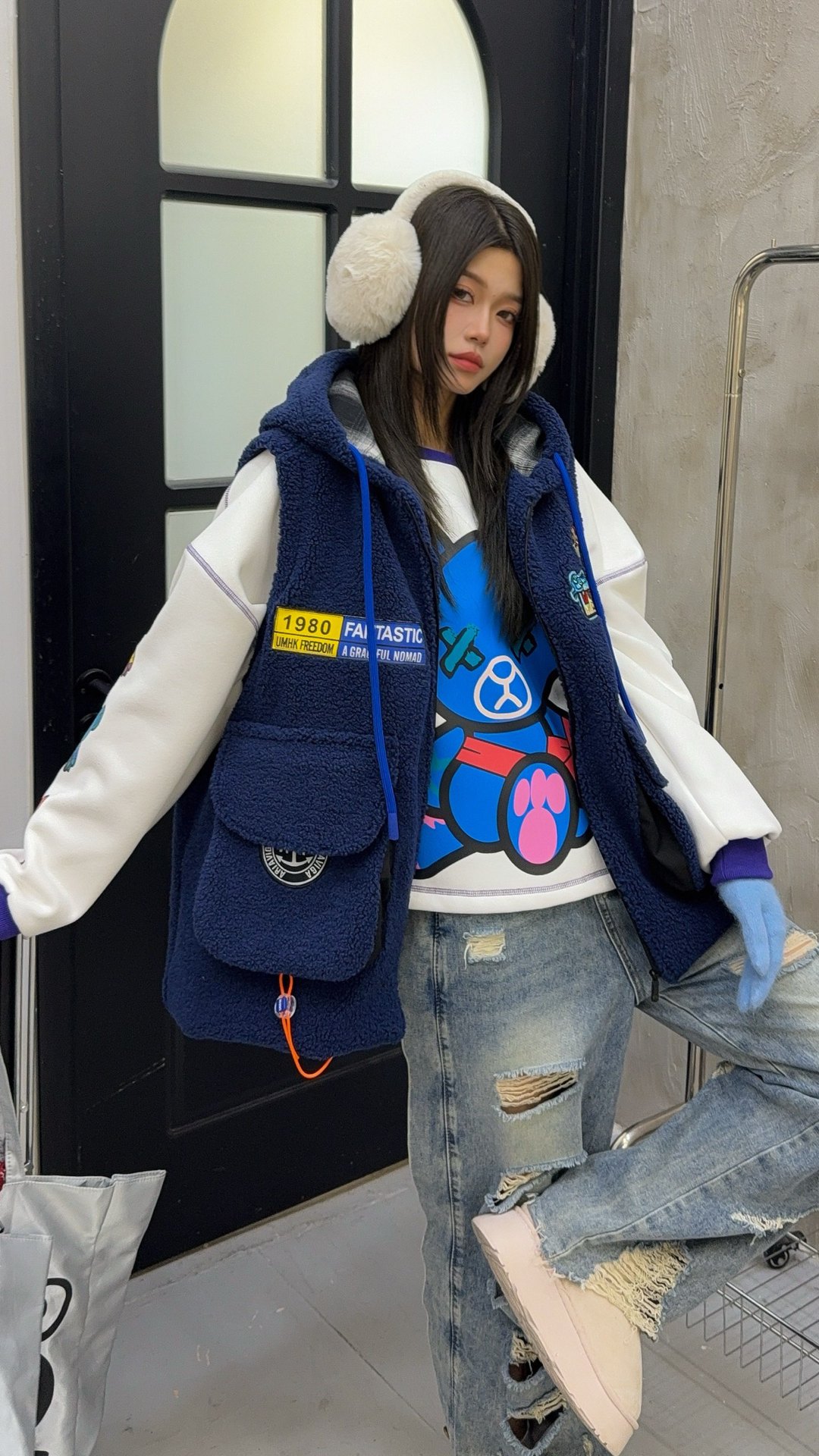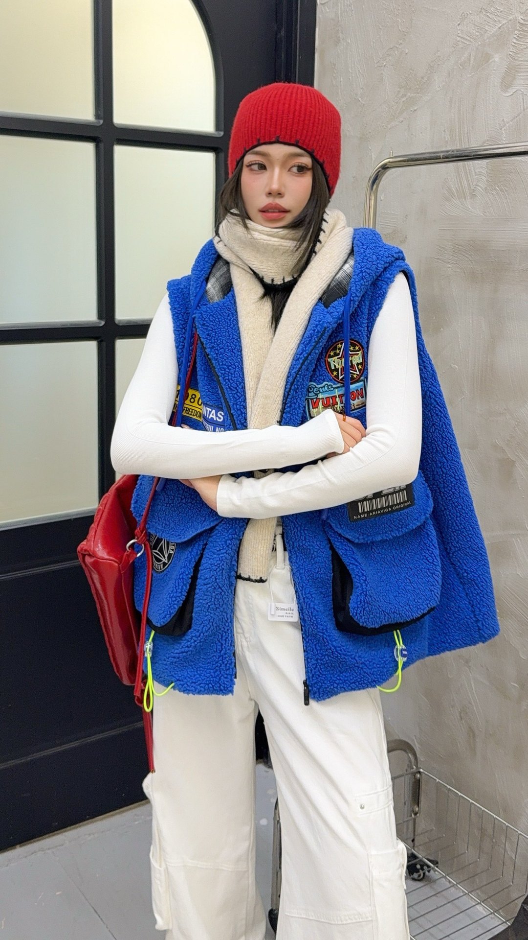 秋冬季新款羊羔绒马甲女士外套坎肩拼接潮流工装大兜抽绳连帽马夹
