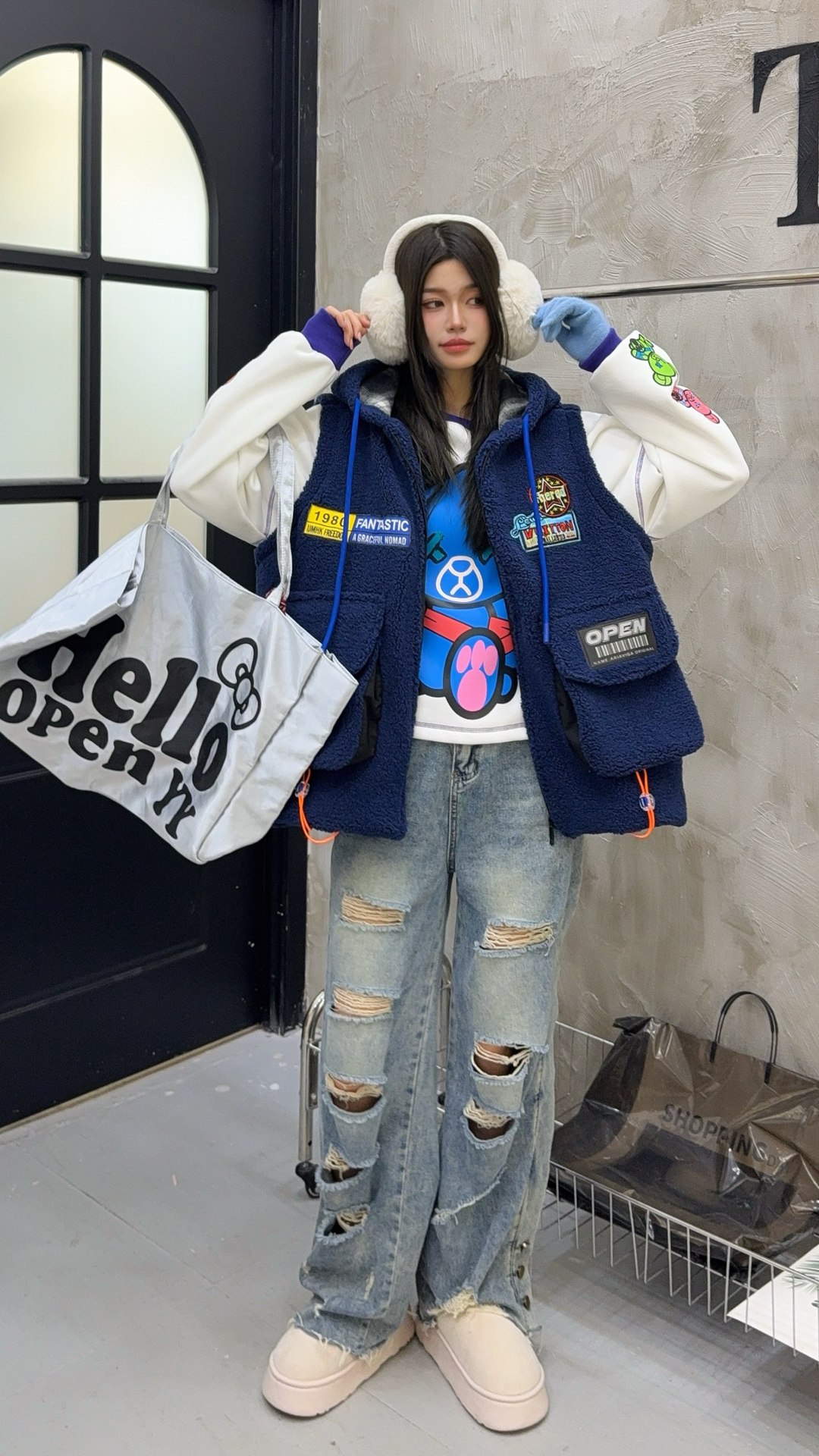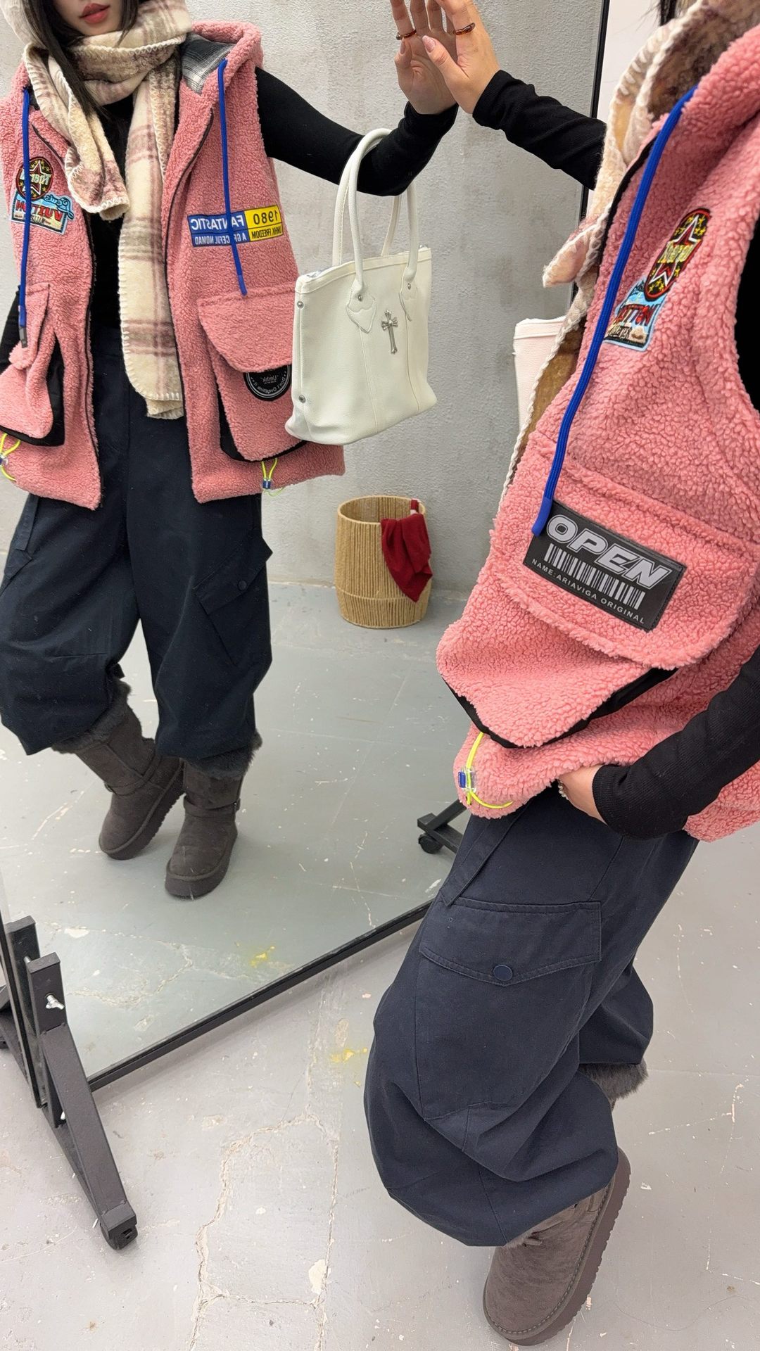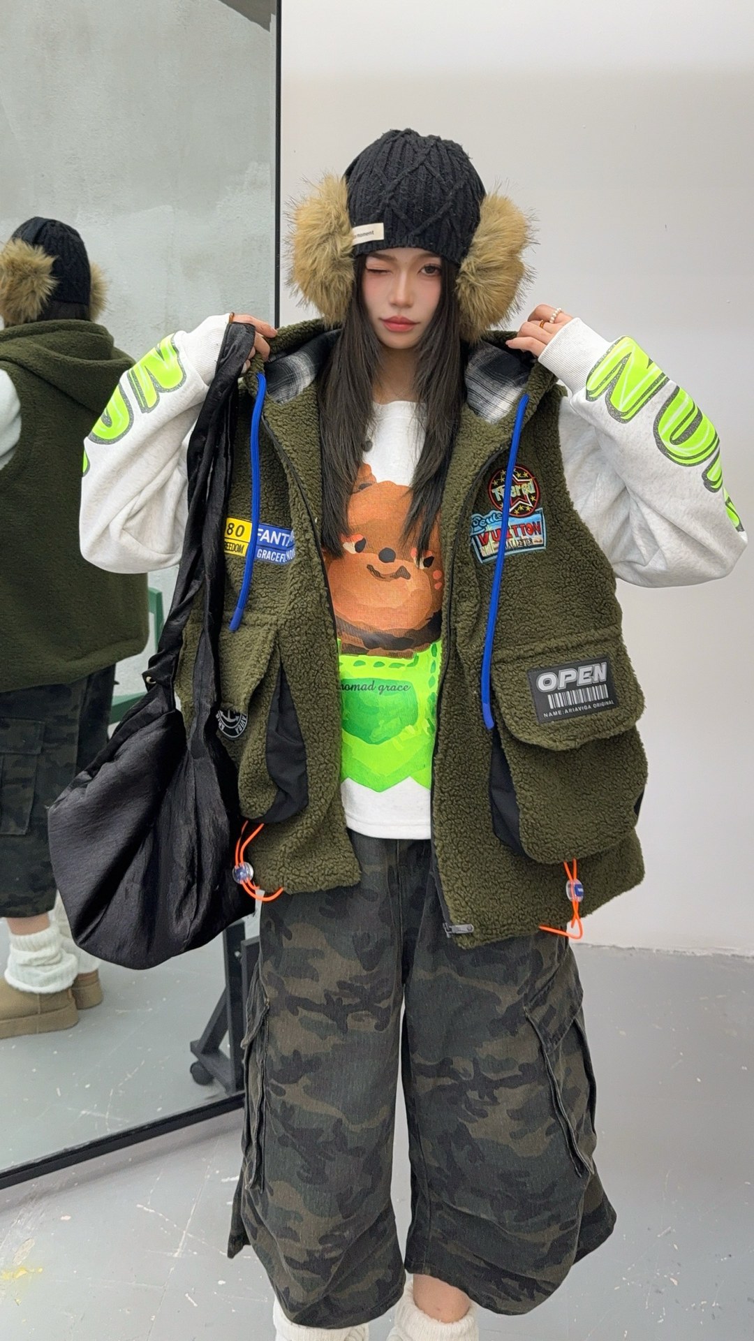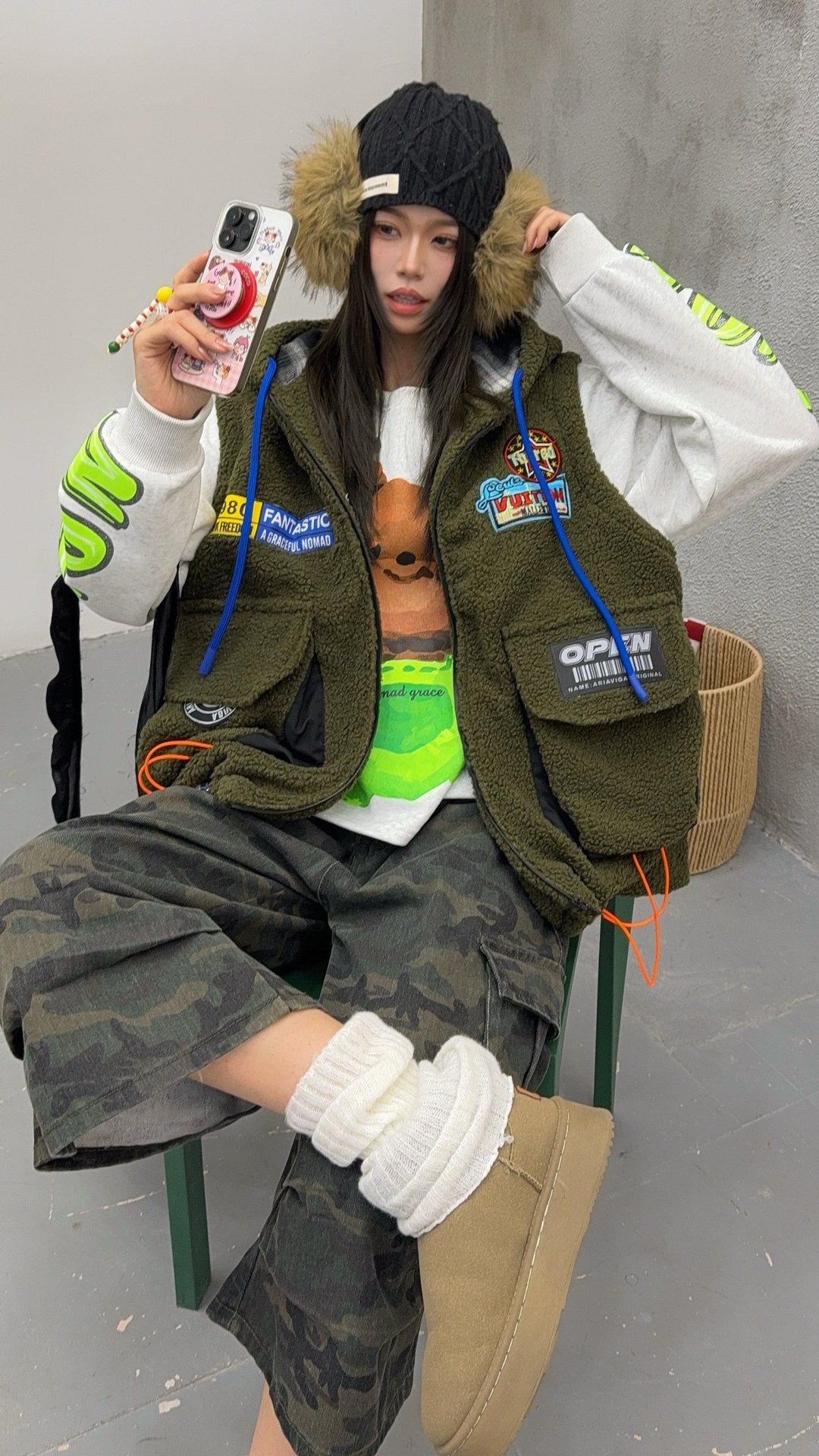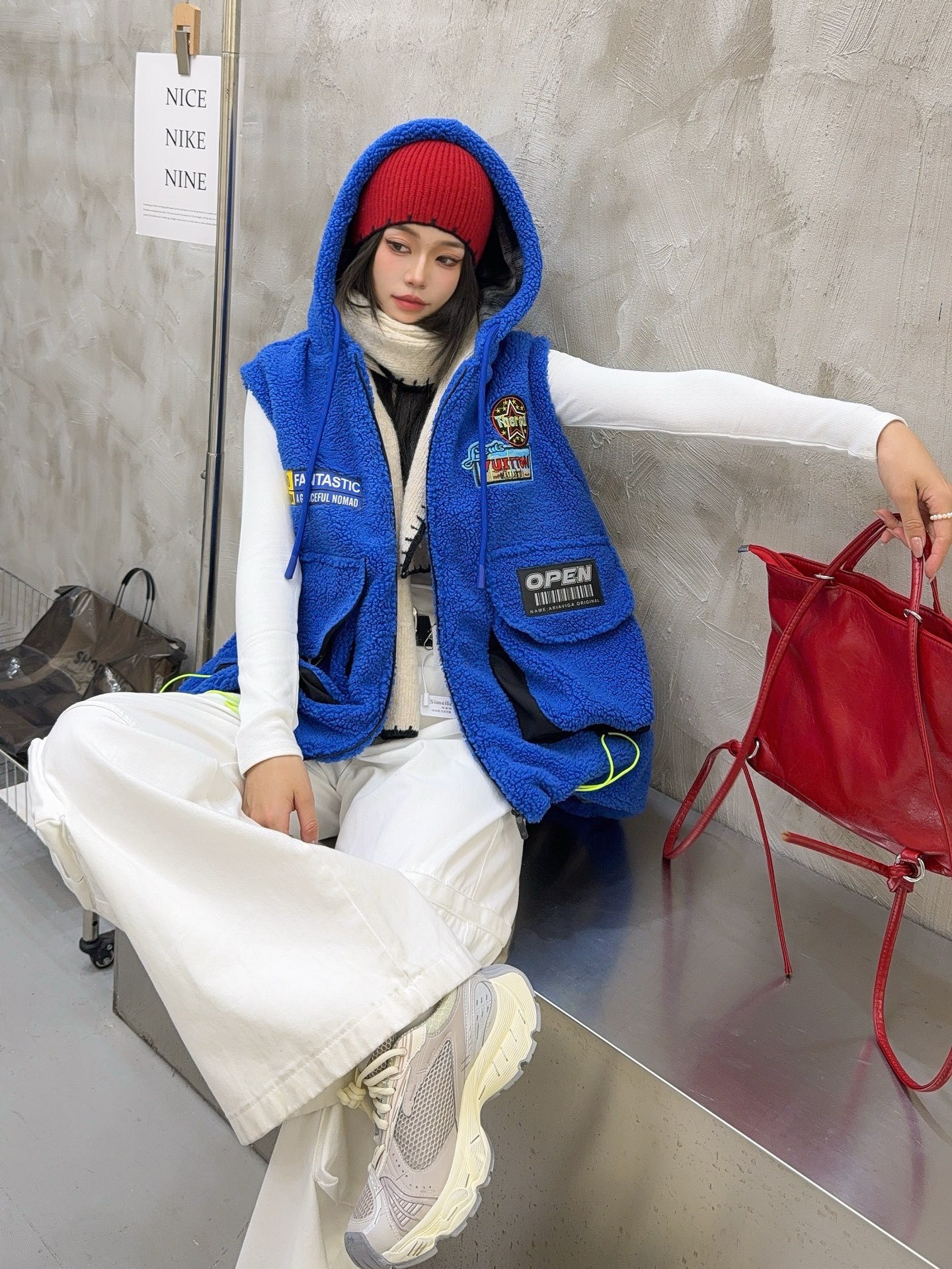 秋冬季新款羊羔绒马甲女士外套坎肩拼接潮流工装大兜抽绳连帽马夹