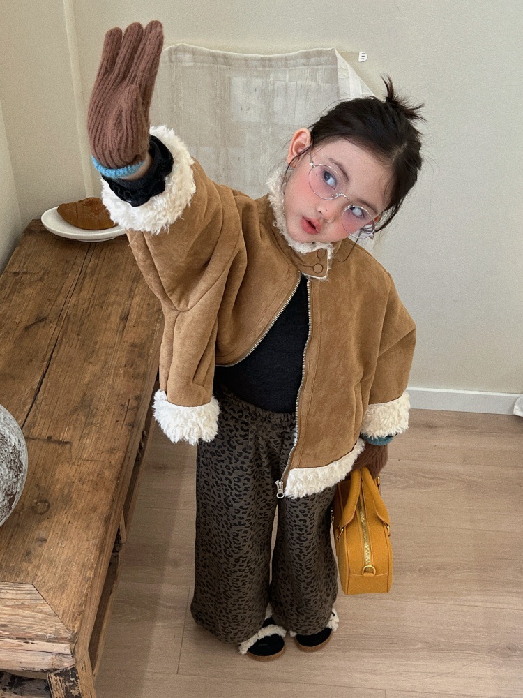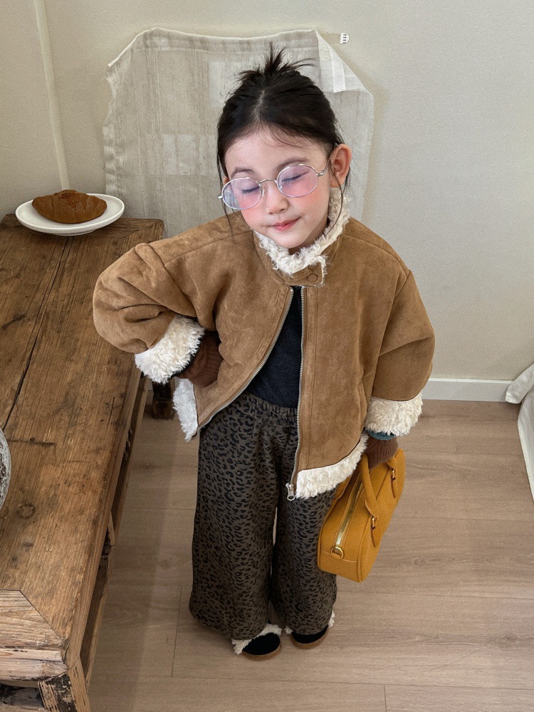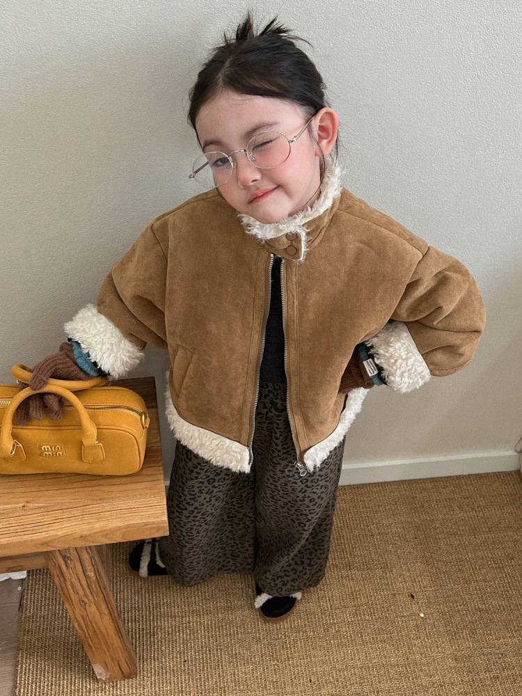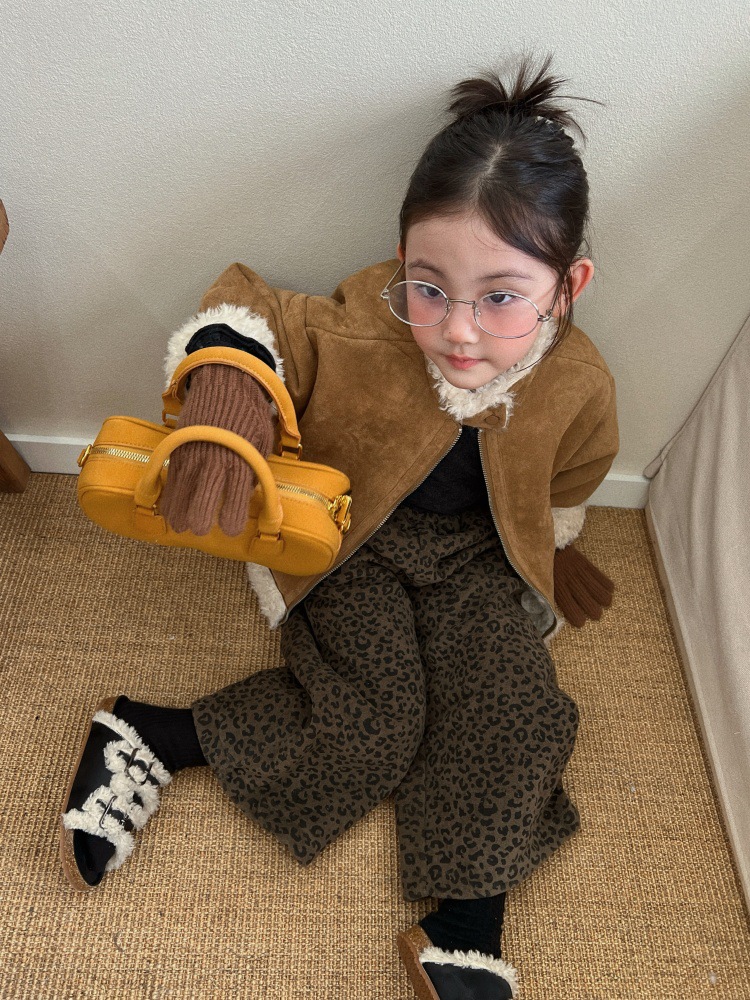 黄棕色皮毛一体外套; 豹纹加绒直筒裤