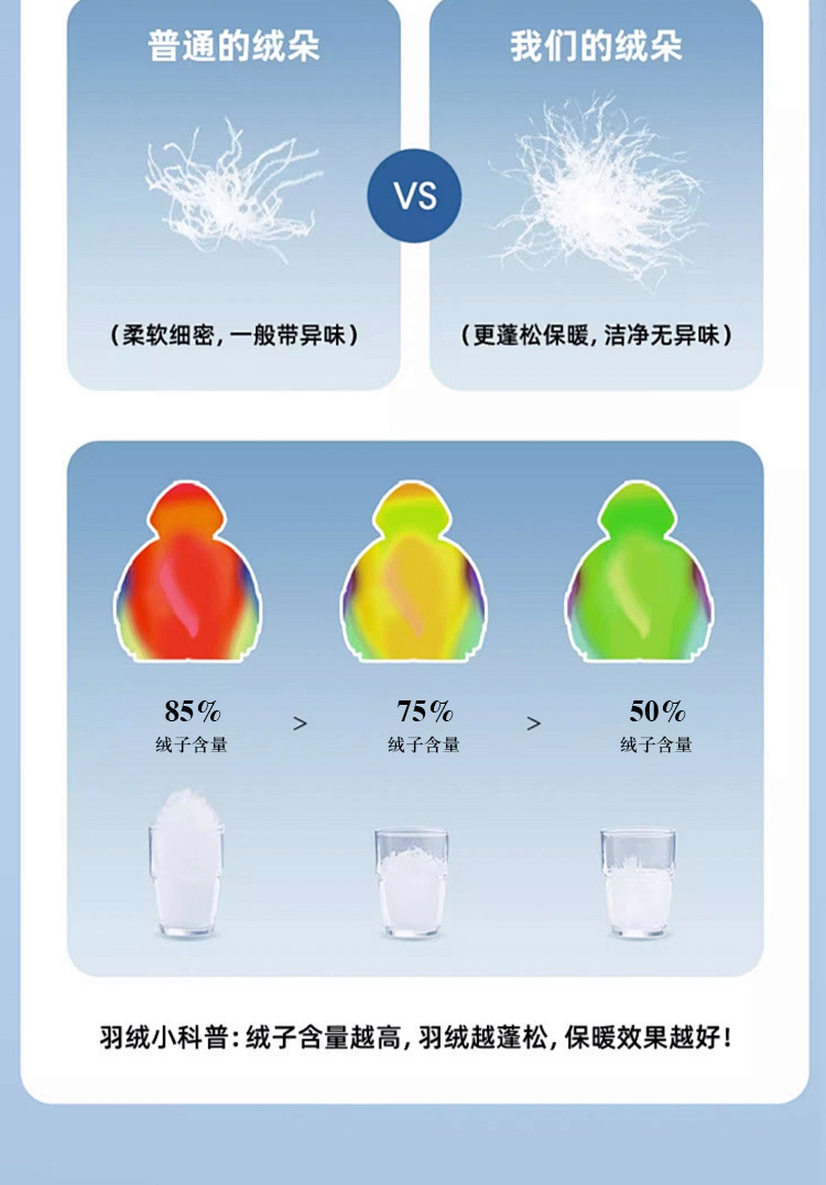 胆料:100%聚酯纤维 主填充物:鸭绒 绒子含量 85%
