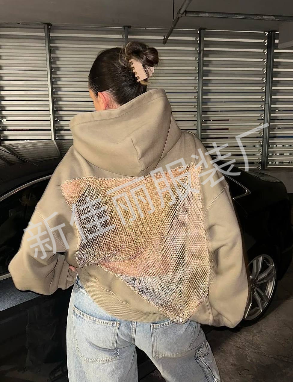 欧美跨境2025秋冬新款女装亚马逊时尚纯色露背镂空网纱连帽衫卫衣