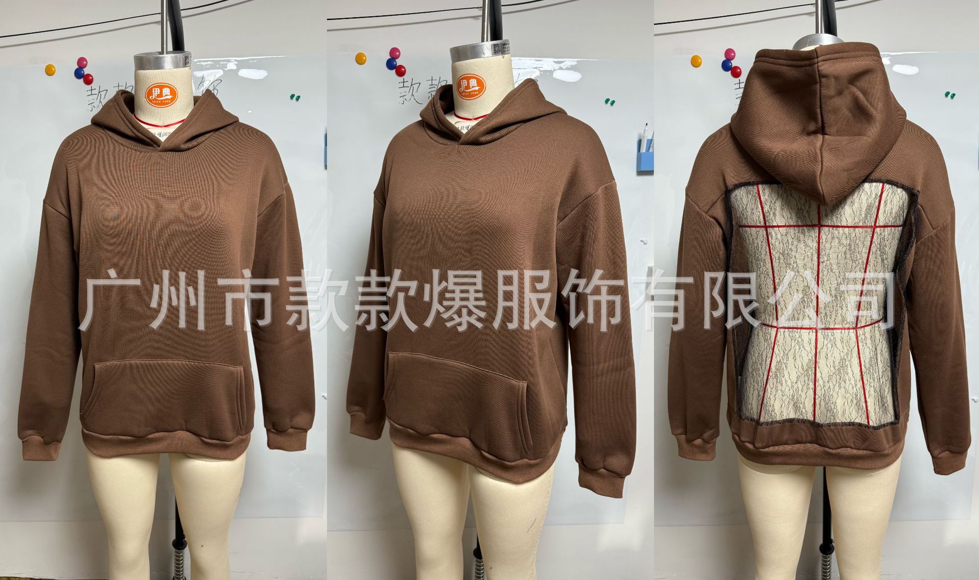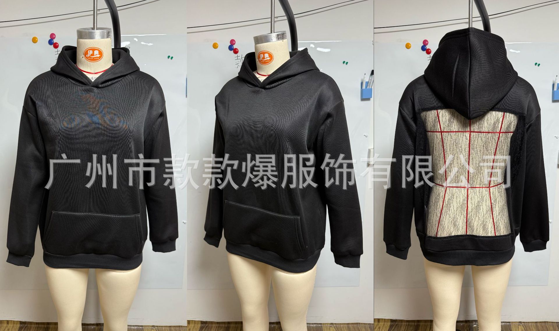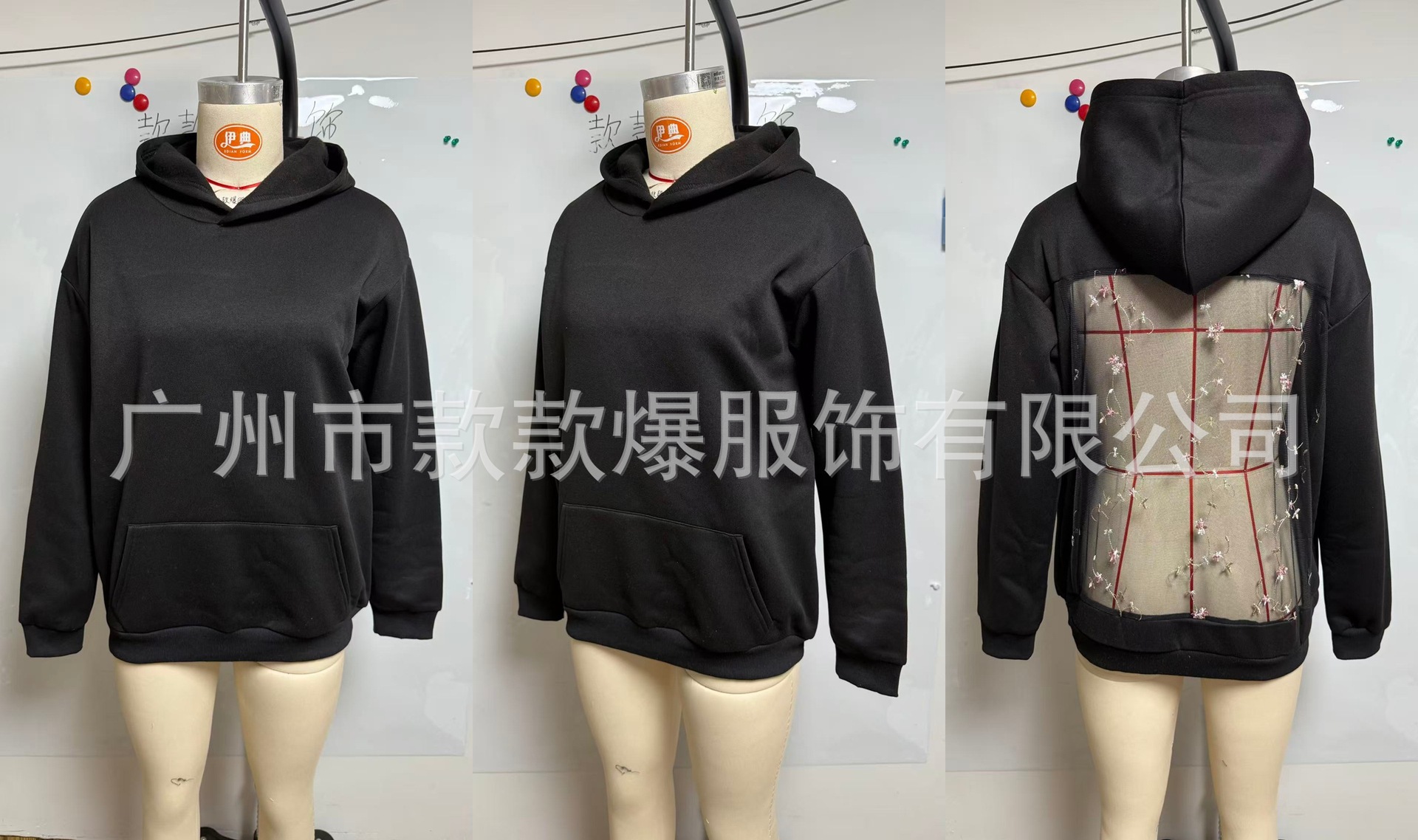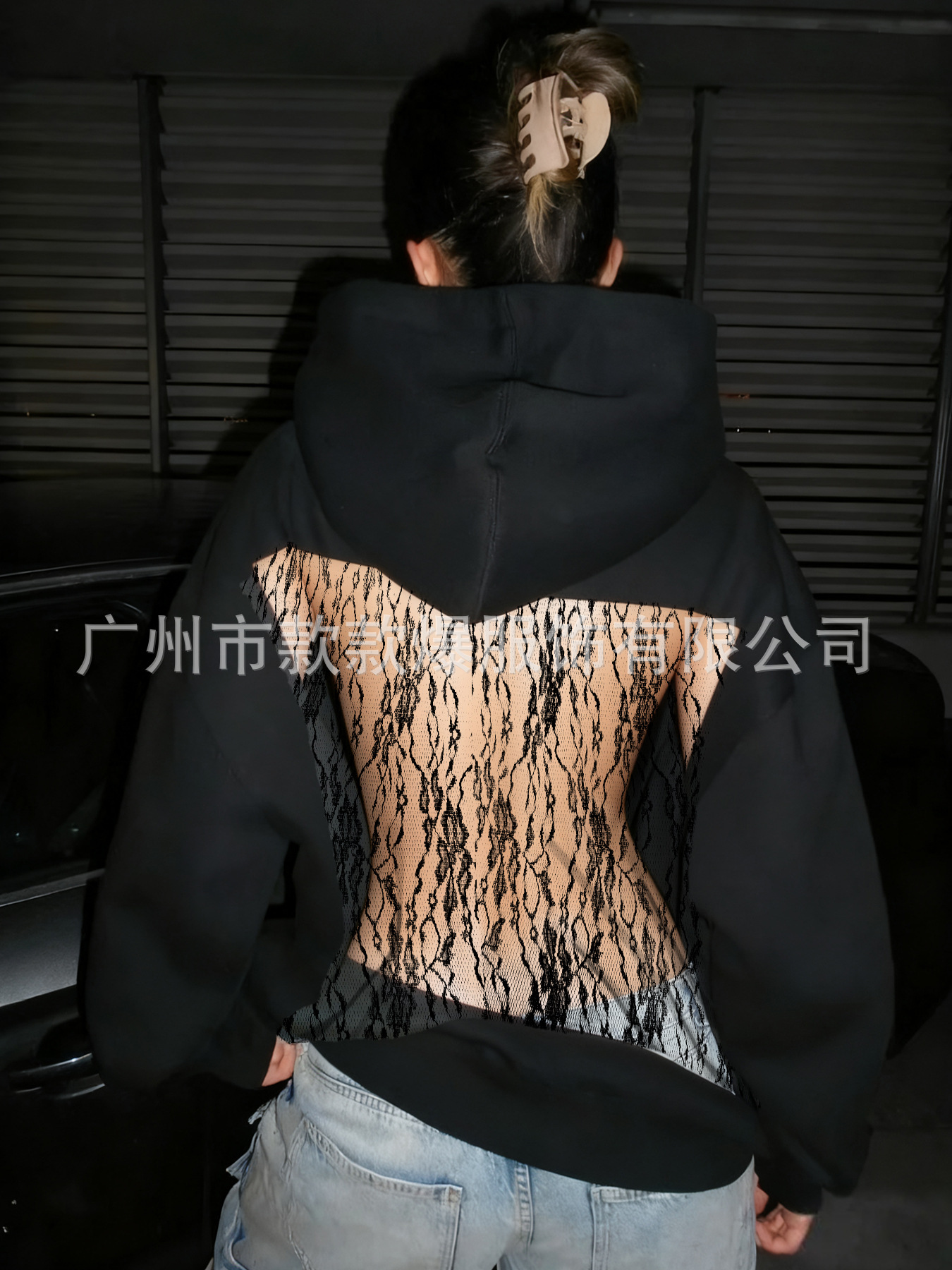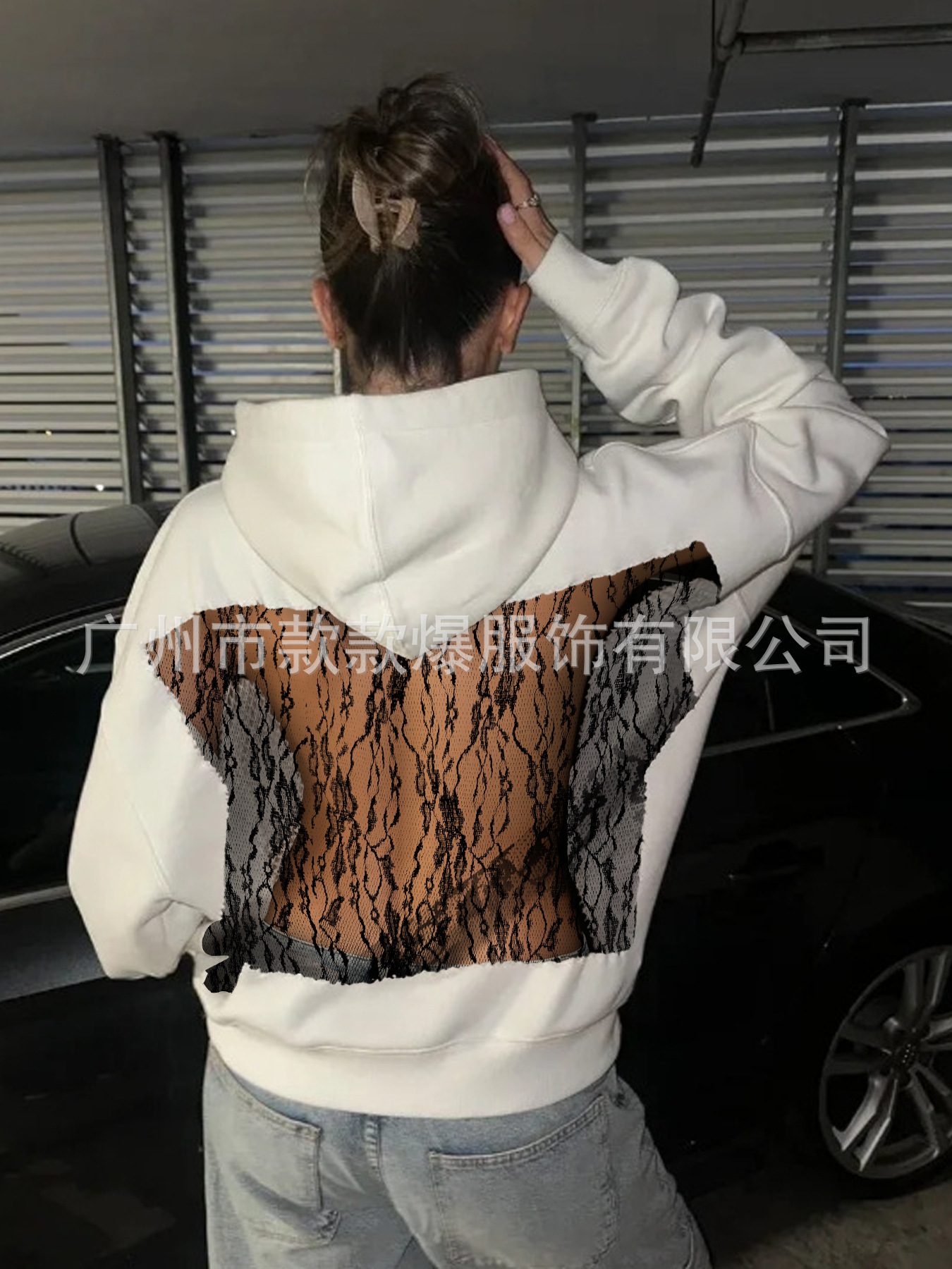 欧美跨境2025秋冬新款女装亚马逊时尚纯色露背镂空网纱连帽衫卫衣