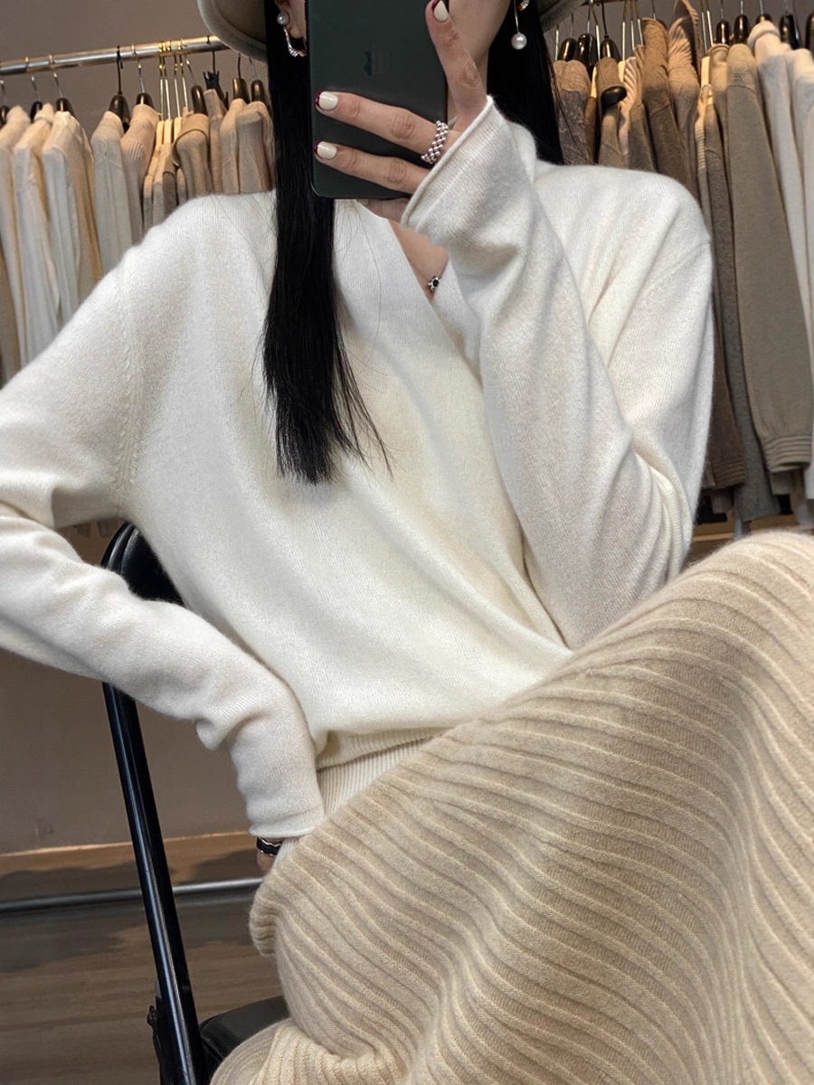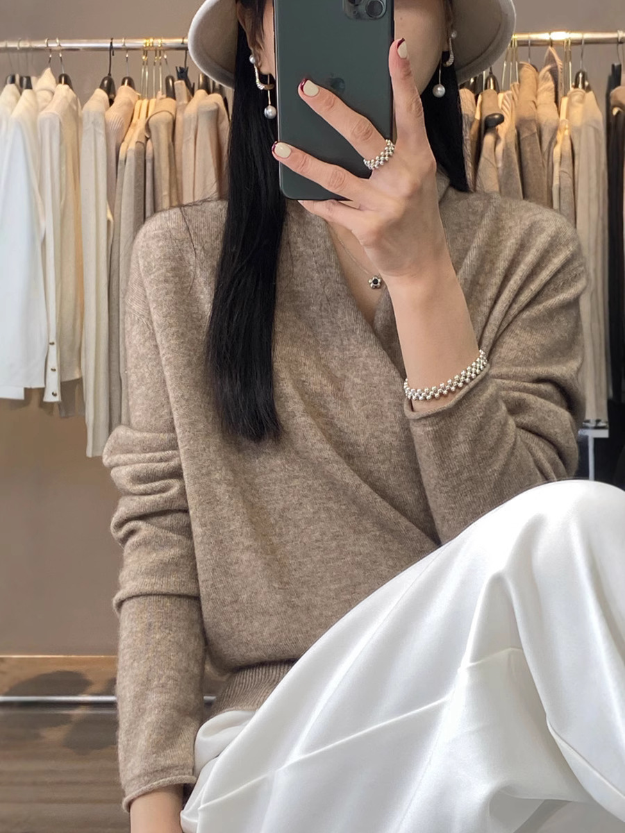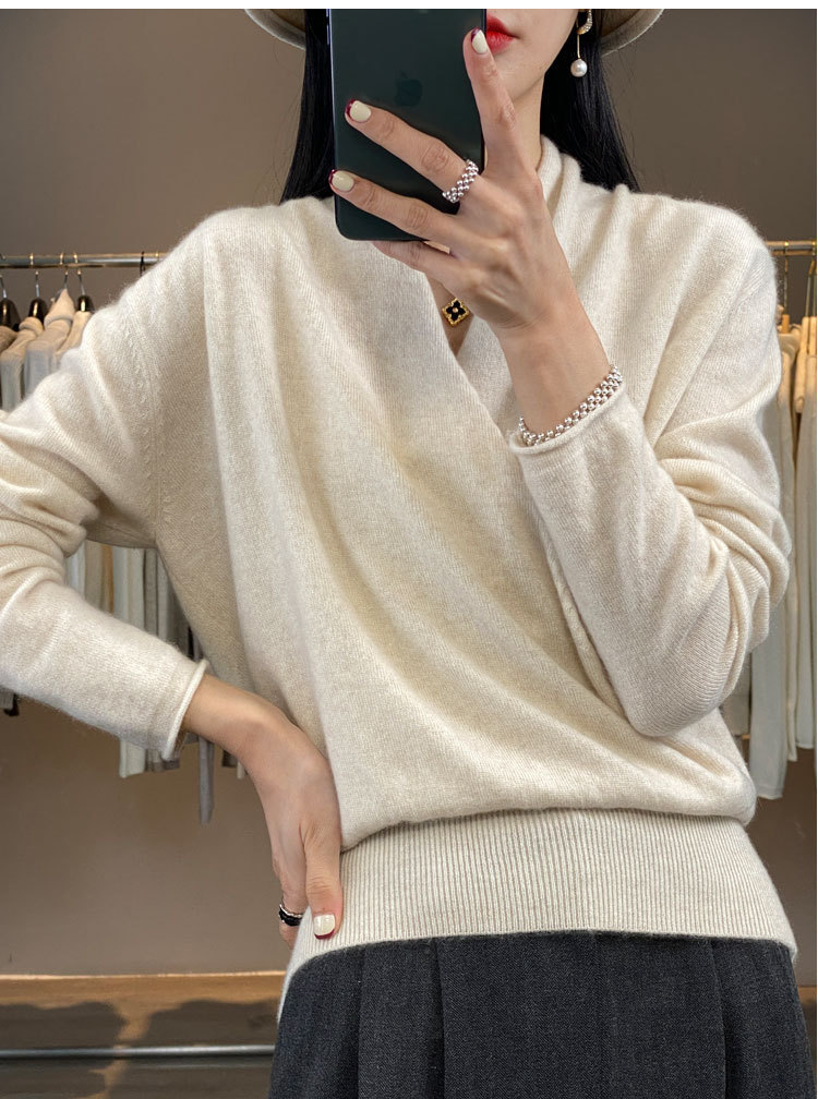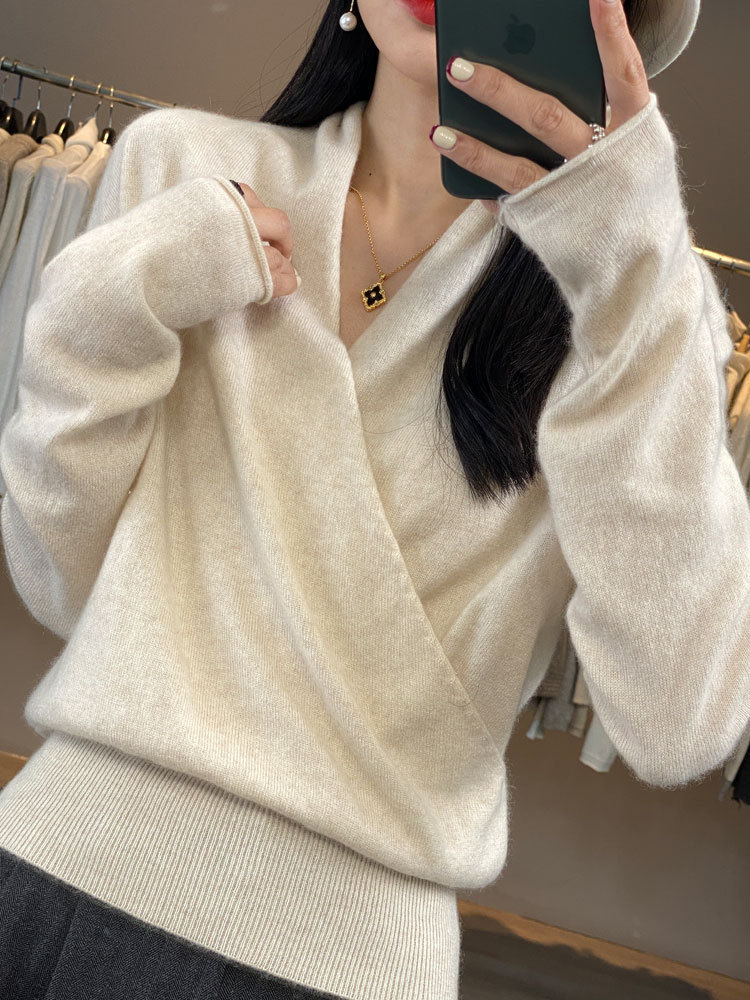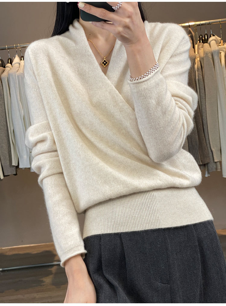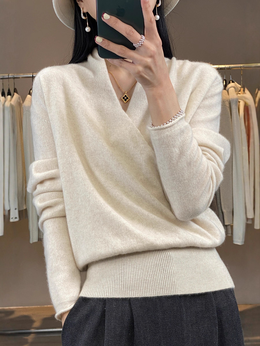 100纯羊毛长袖套头女士V领宽松秋冬新款交叉套头羊绒毛衣针织上衣