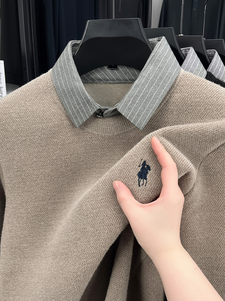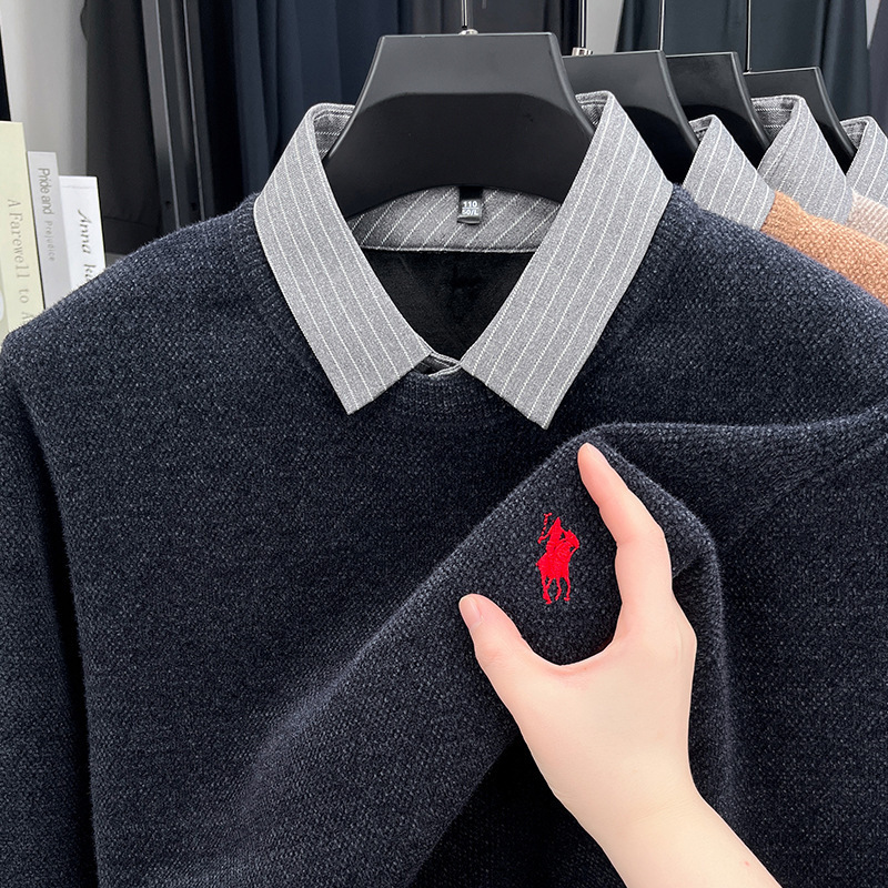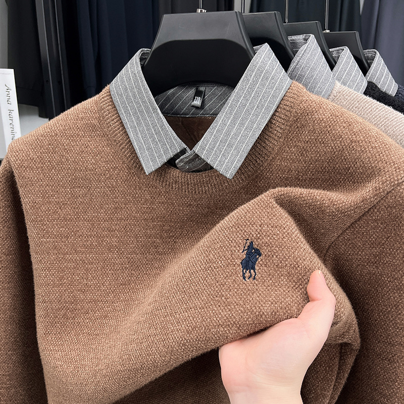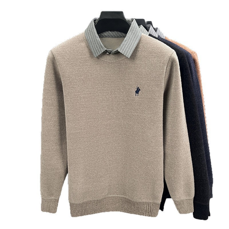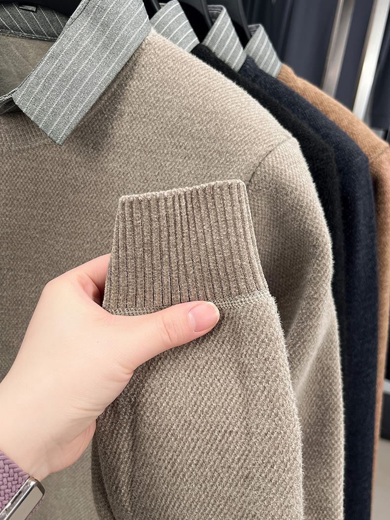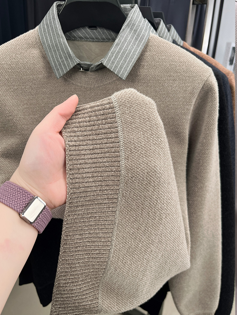 Вязаная нижняя рубашка, осенне-зимний мужской свитер, рубашка с воротником, искусственный топ из двух предметов, мужской зимний модный теплый длинный рукав