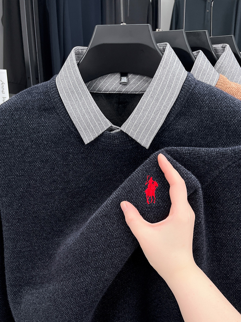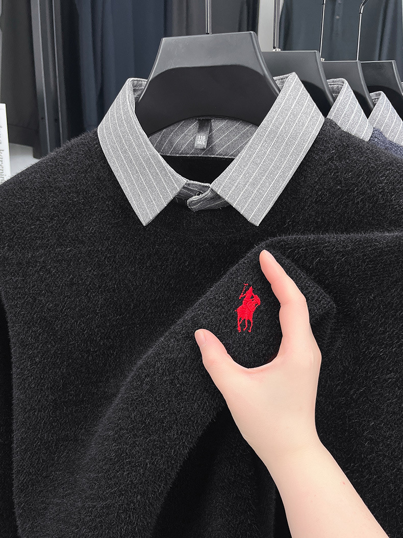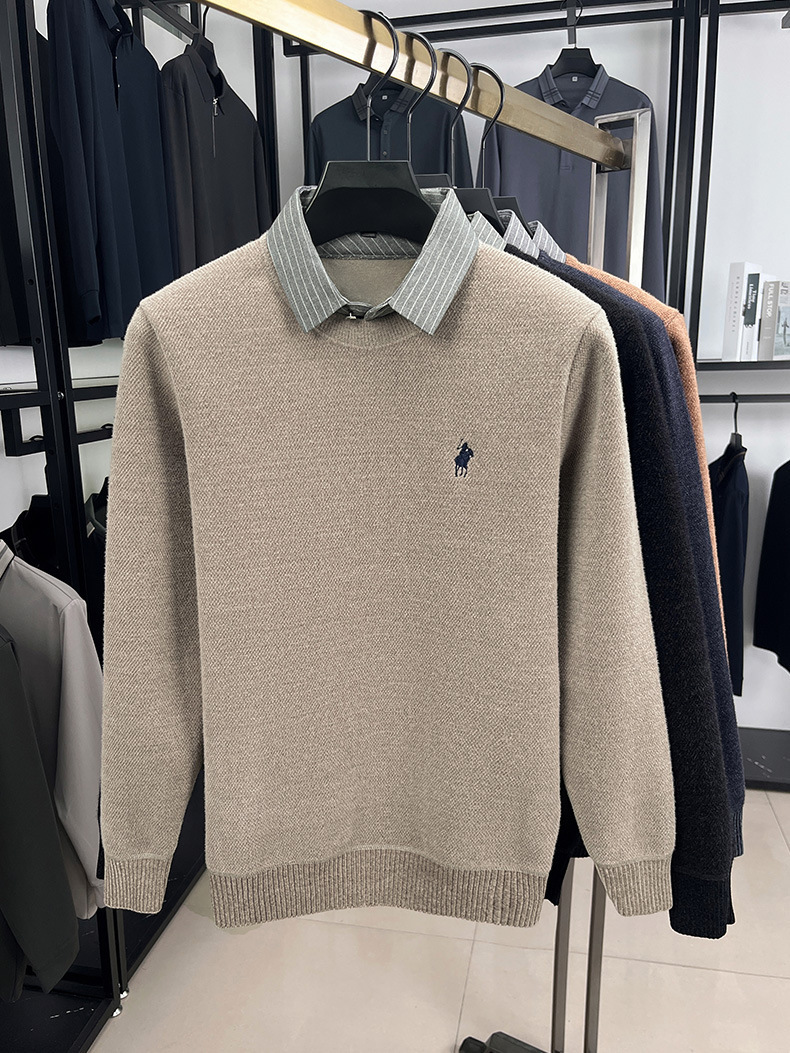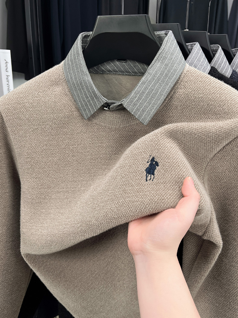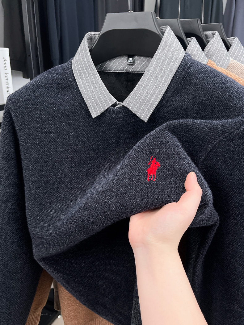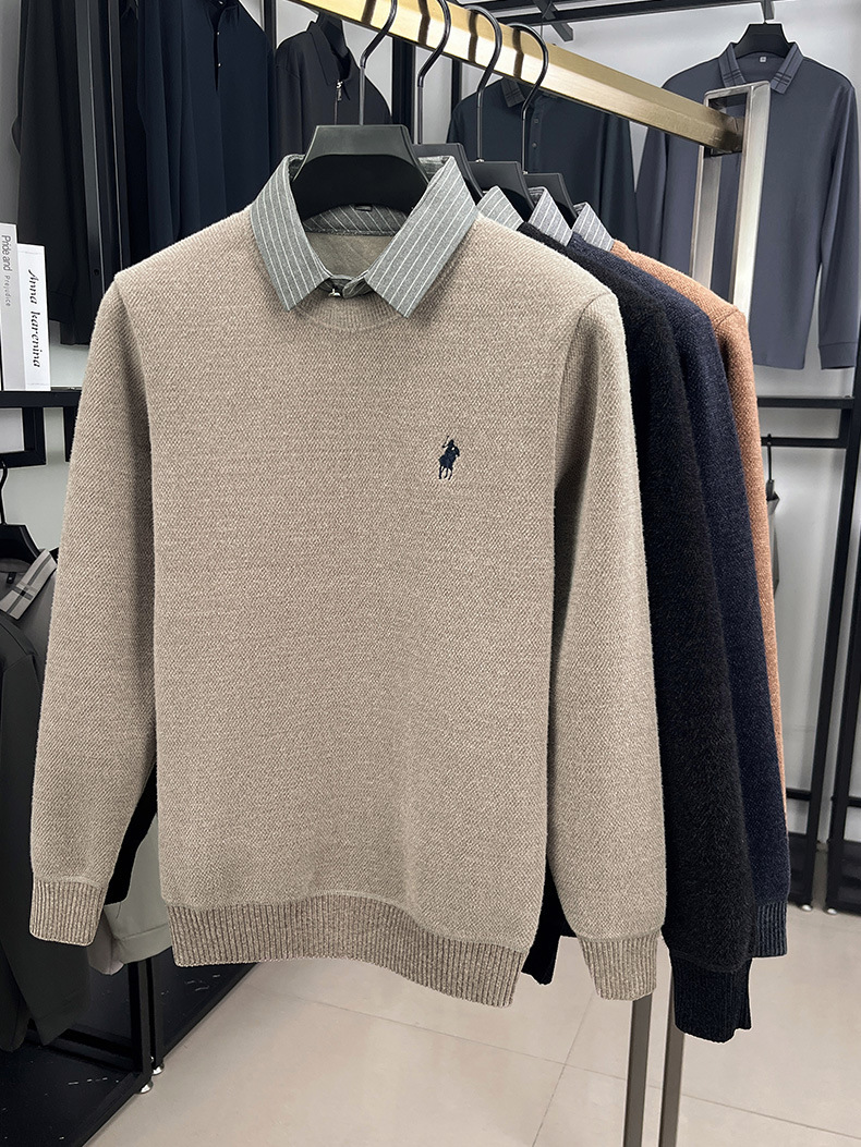Вязаная нижняя рубашка, осенне-зимний мужской свитер, рубашка с воротником, искусственный топ из двух предметов, мужской зимний модный теплый длинный рукав