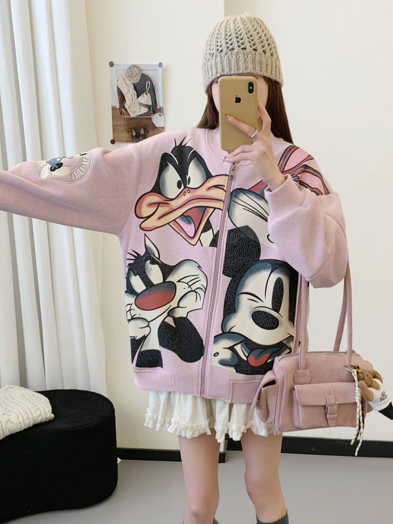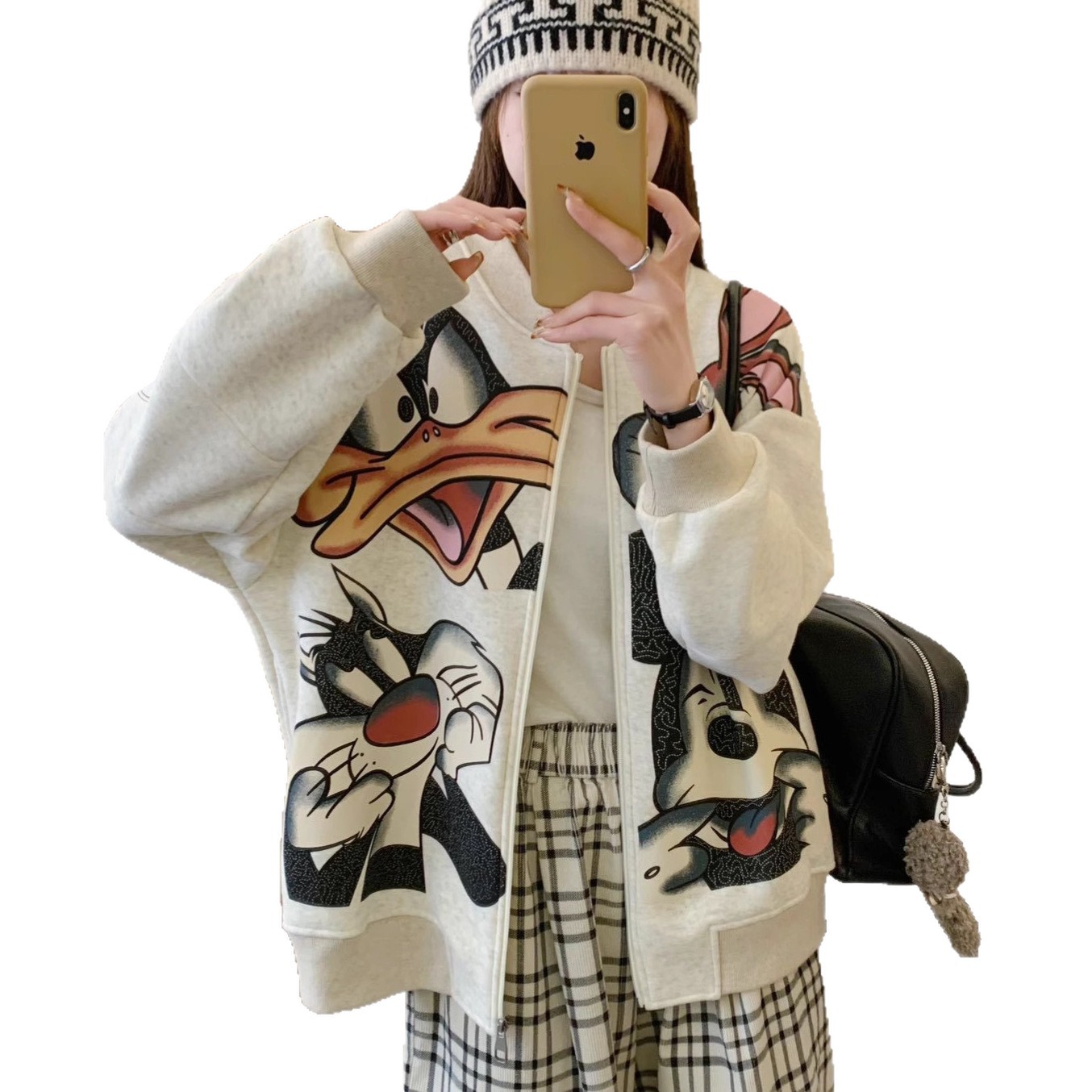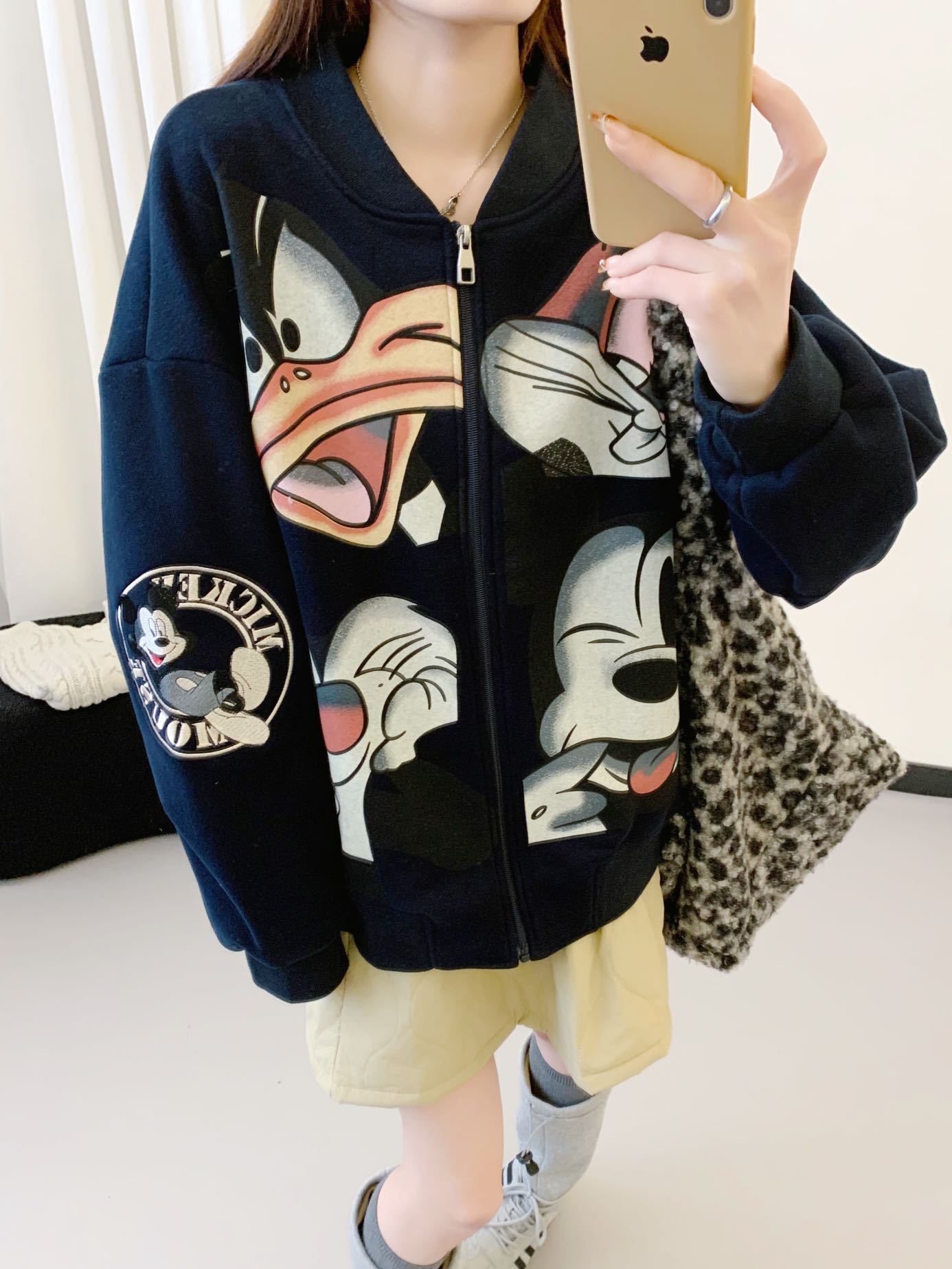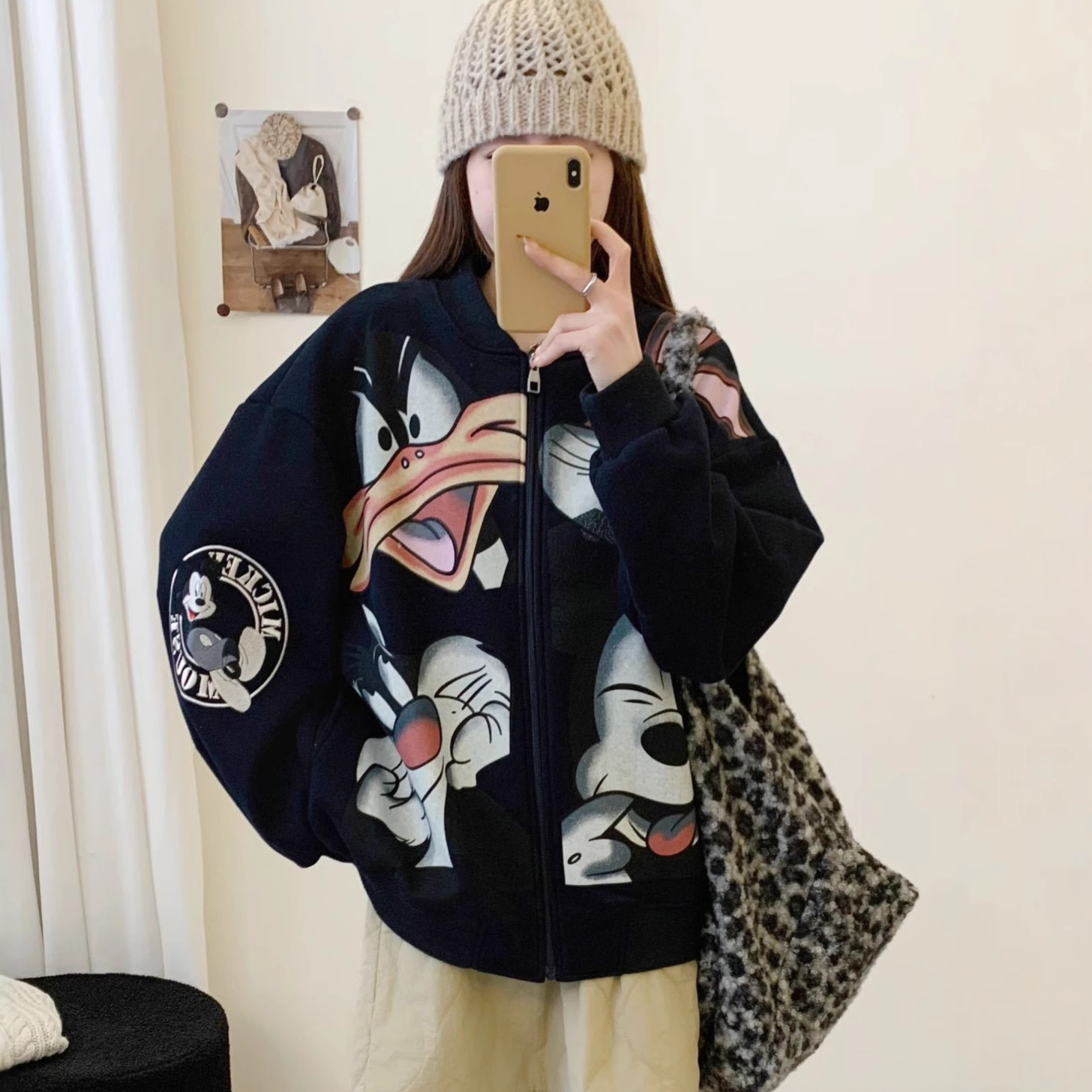 欧货潮牌刺绣卡通加绒棒球服无感印花2025冬季宽松百搭夹克女上衣