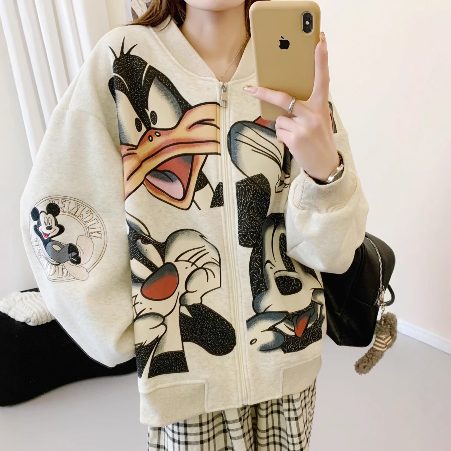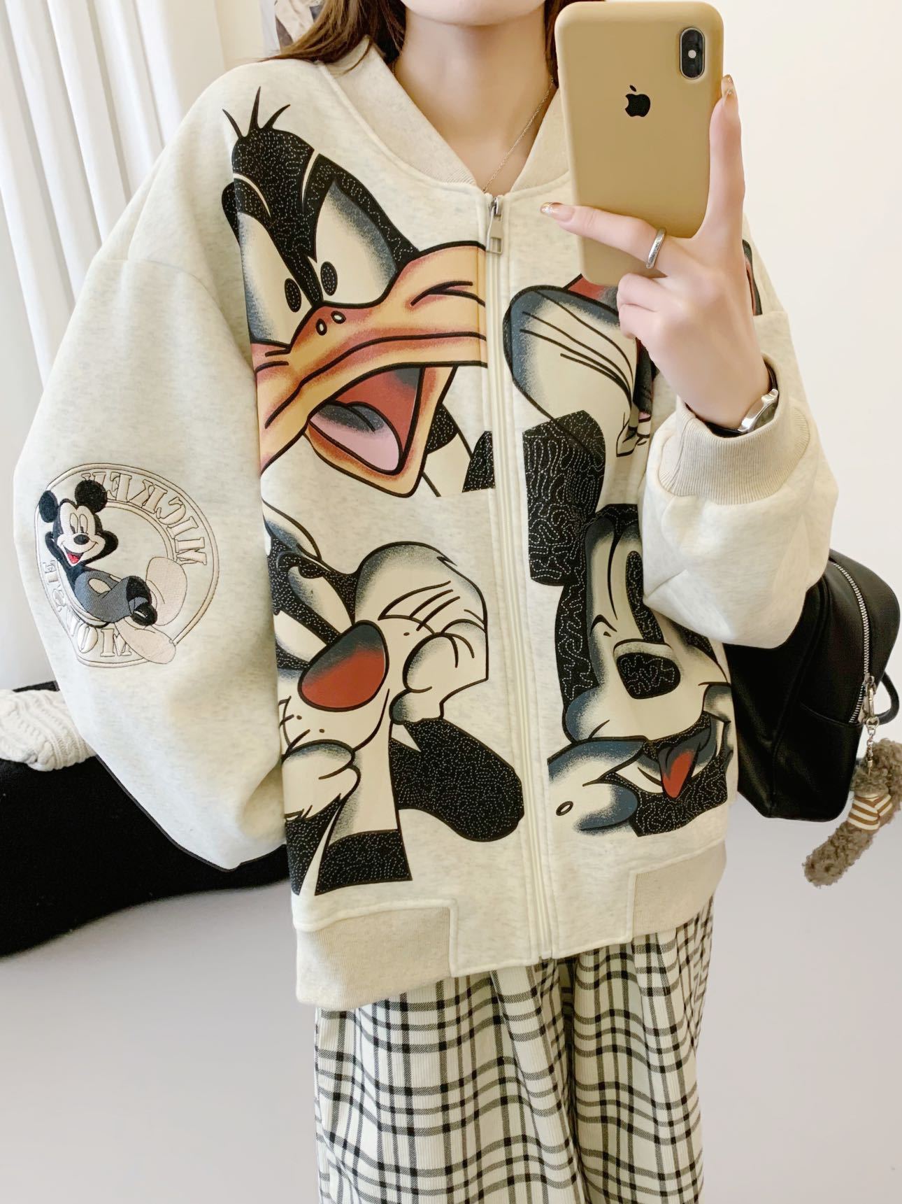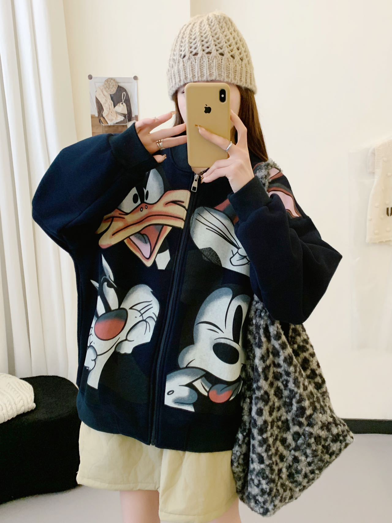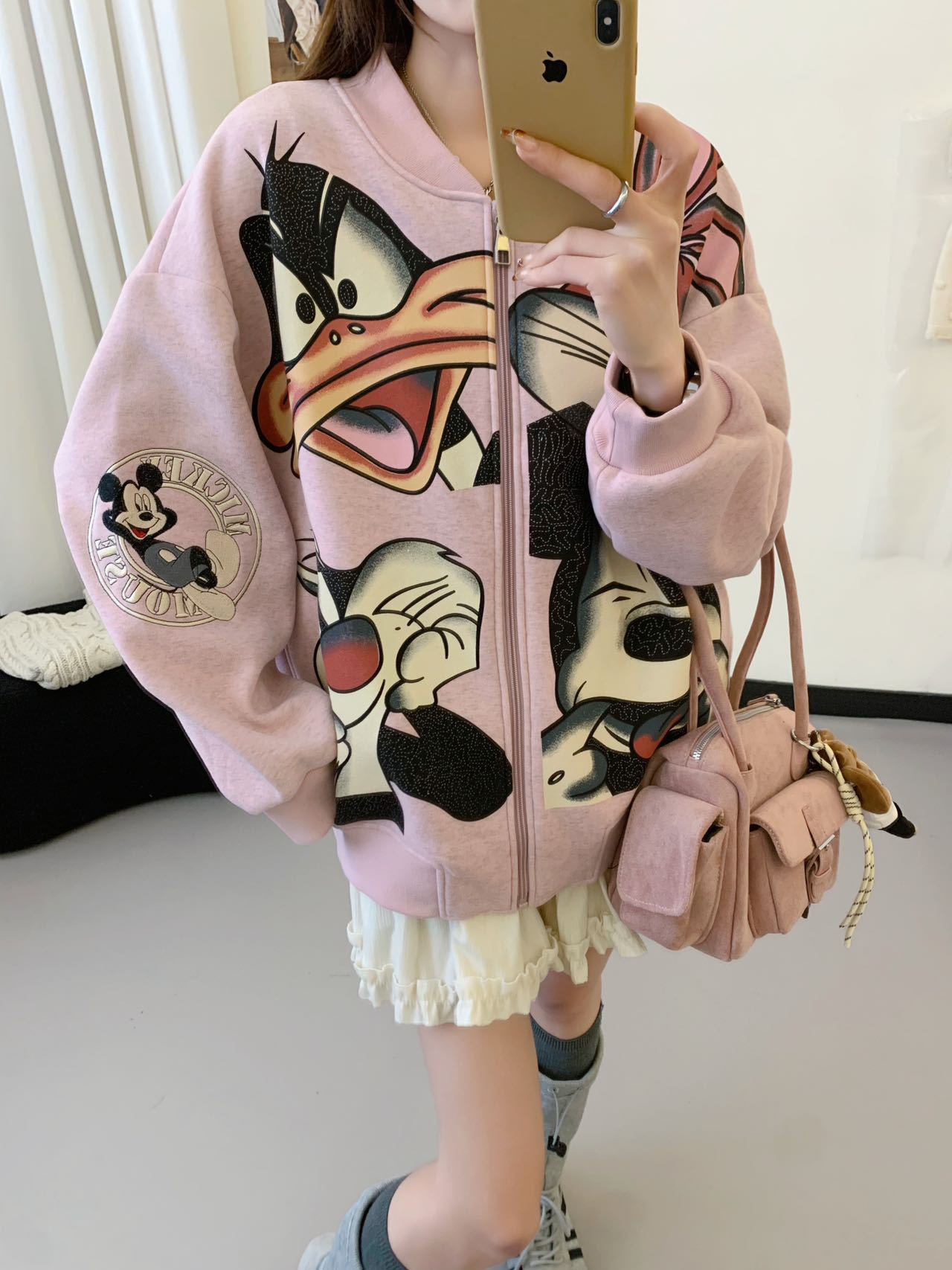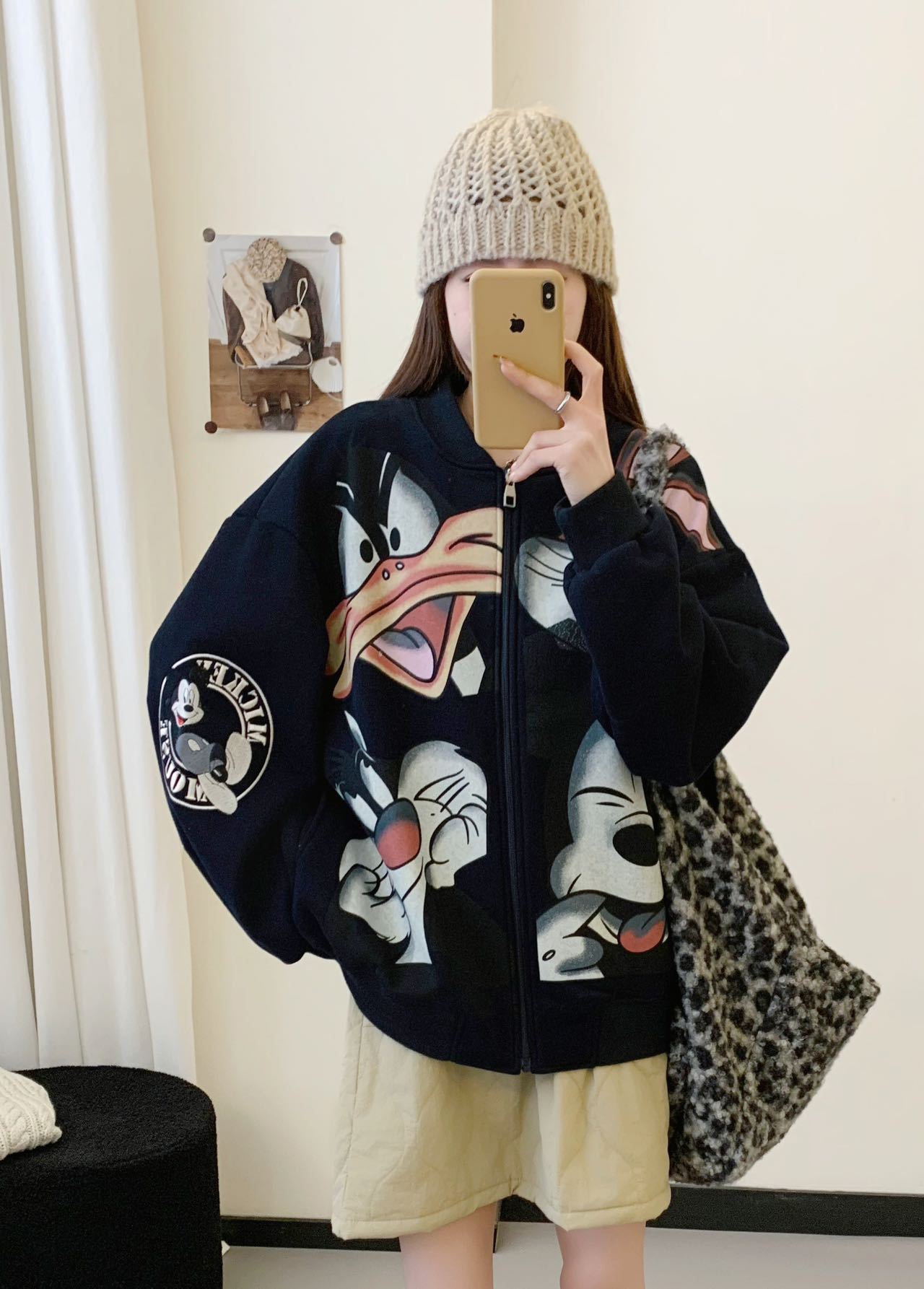 欧货潮牌刺绣卡通加绒棒球服无感印花2025冬季宽松百搭夹克女上衣