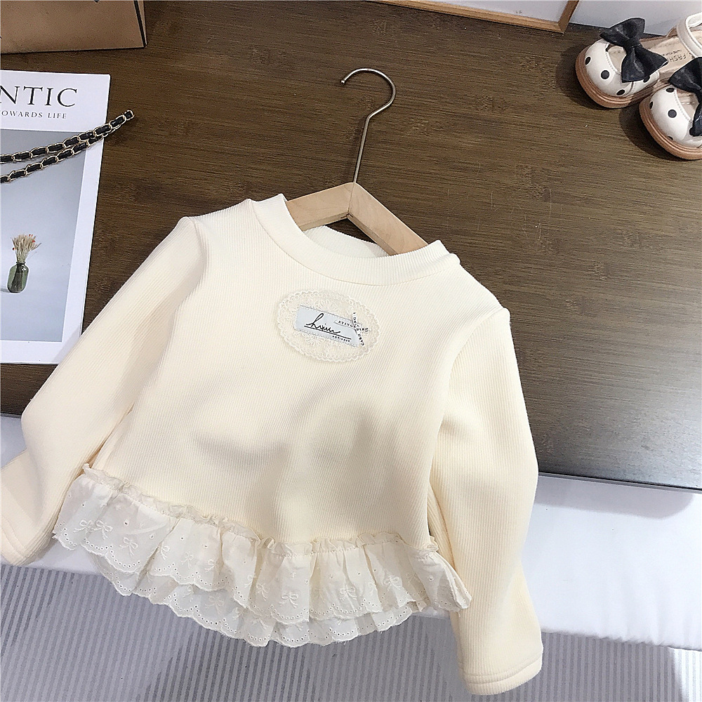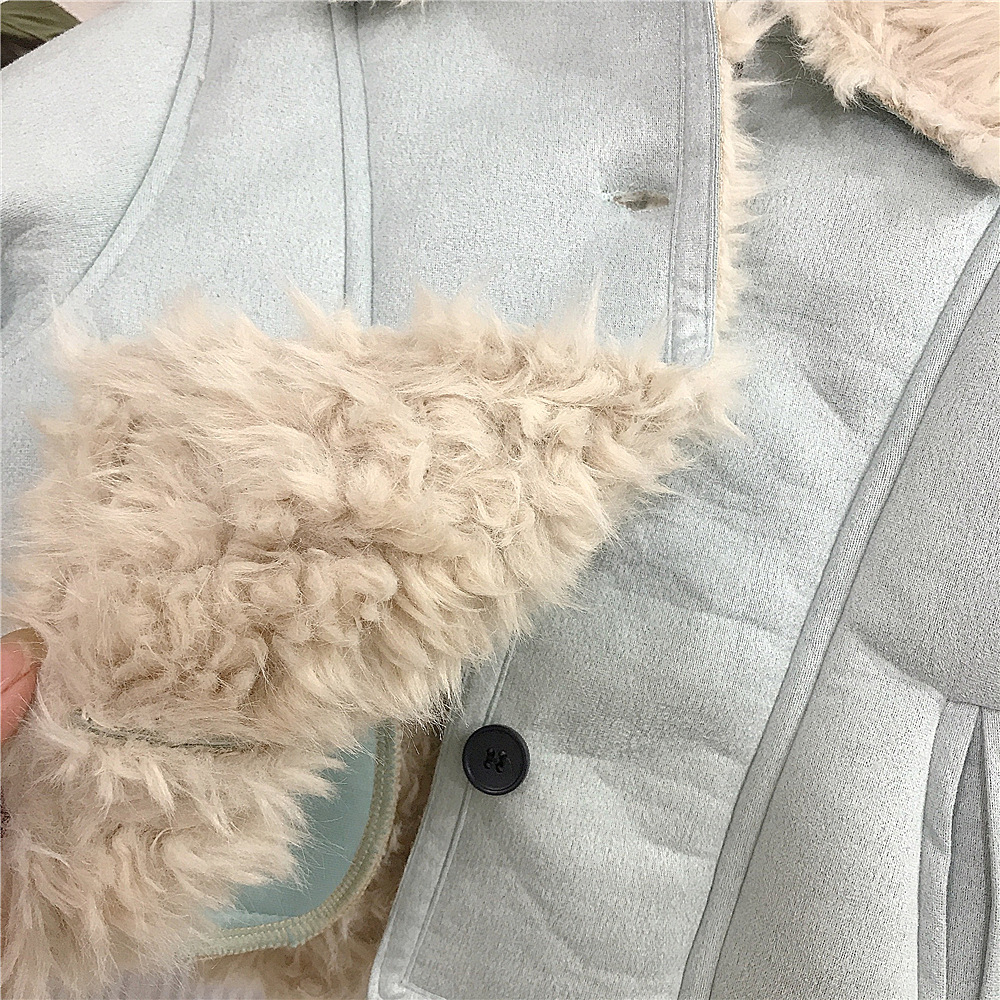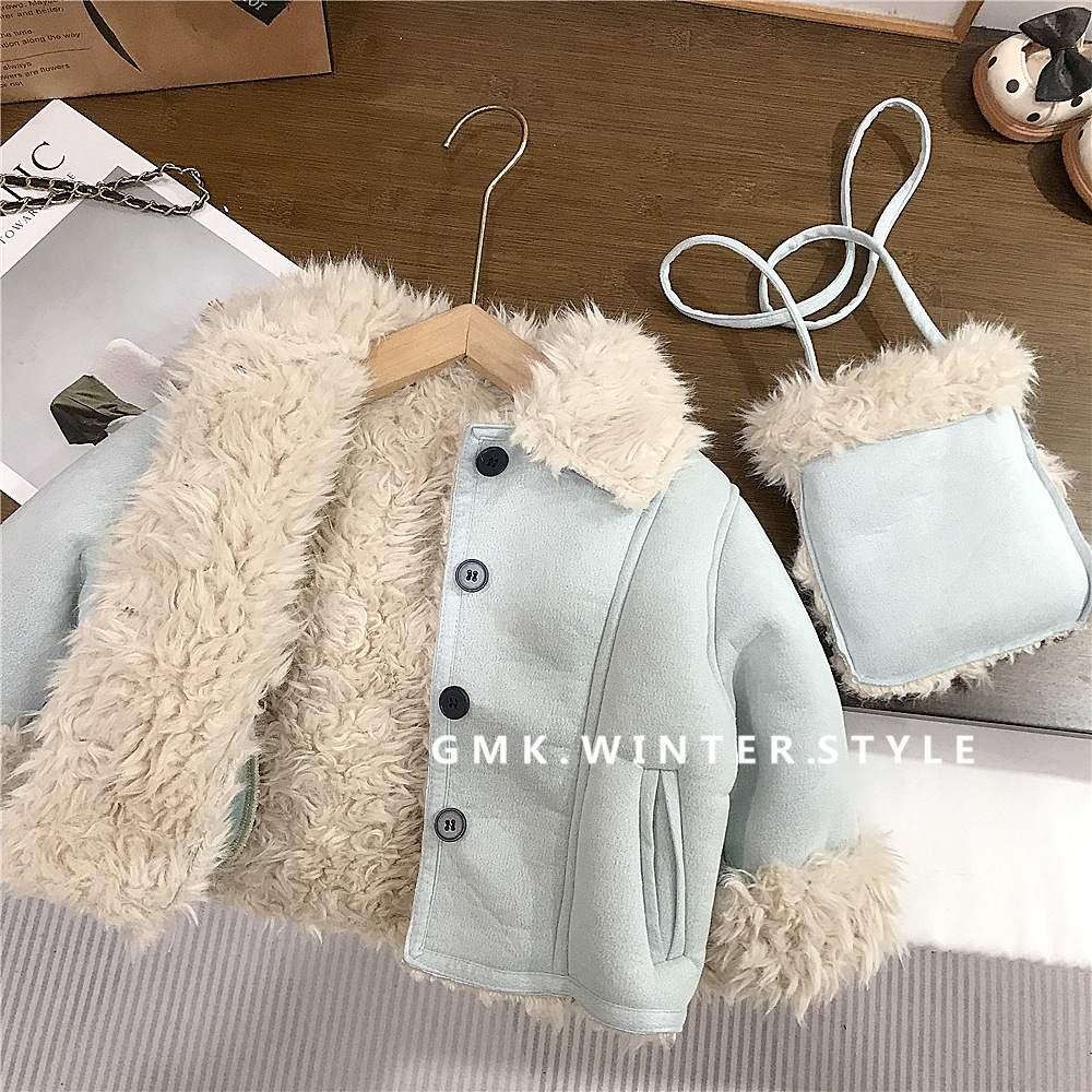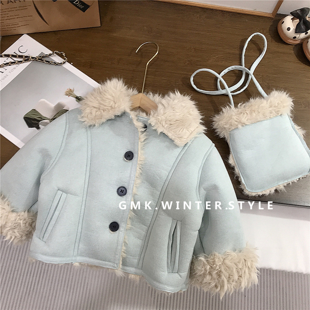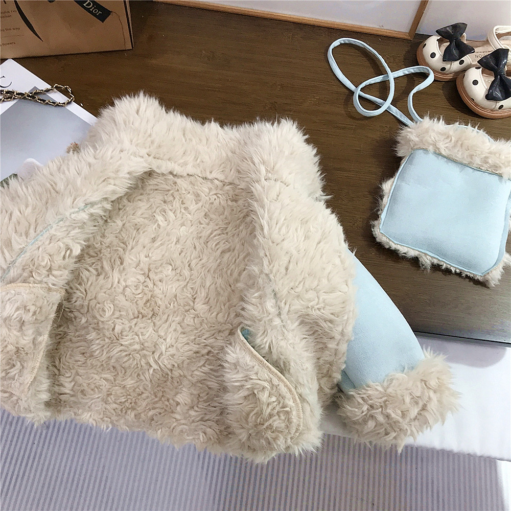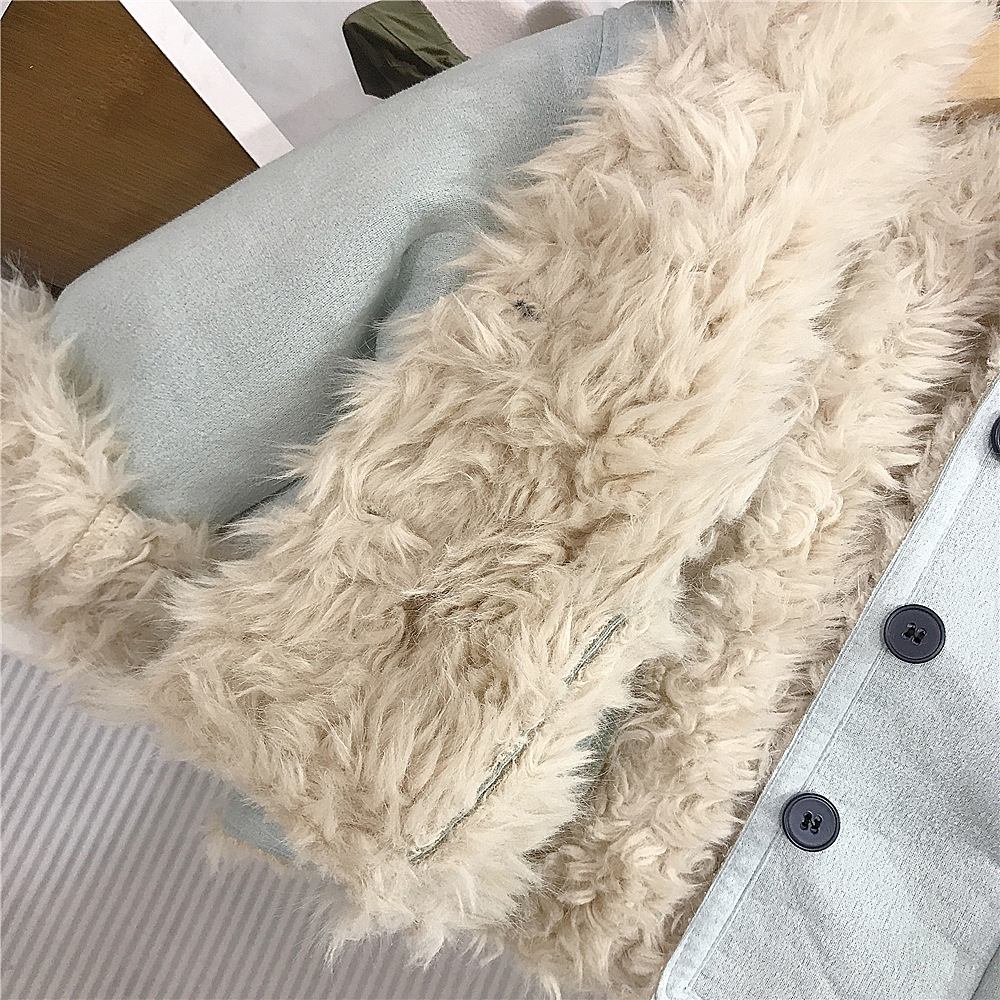 湖蓝包包麂皮绒外套; 加绒蕾丝边打底衫米色
