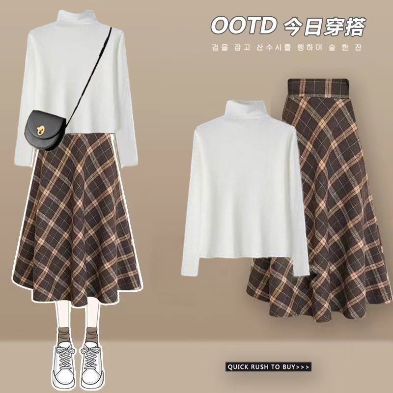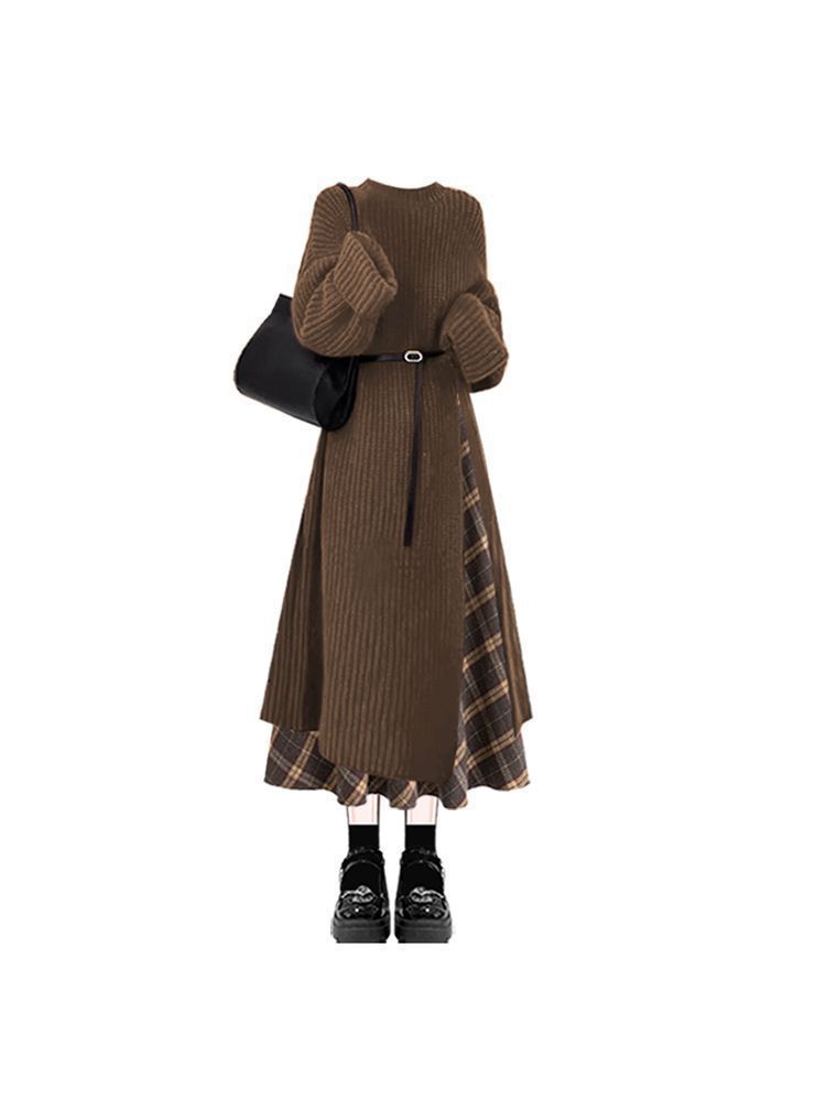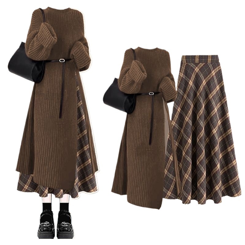 Комплект из двух частей: коричневая юбка-свитер + клетчатая юбка; Коричневая юбка-свитер цельная; Юбка в клетку цельная; Белый верх цельный