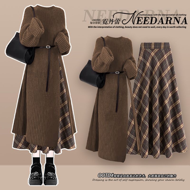 Зимний комплект одежды для женщин 2025, новая мода Maillard, вязаный свитер и юбка, юбка для стройнящего эффекта, комплект из двух предметов