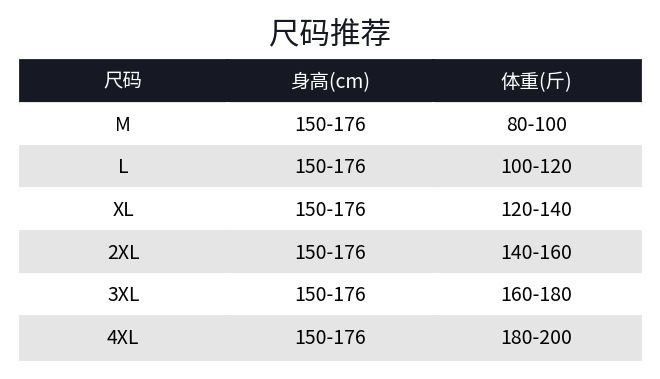 Рекомендация М 40-50kg; L Рекомендация 50-60kg; XL рекомендуется 60-70kg; 2XL рекомендуется 70-80kg; 3XL рекомендуется 80-90kg; 4XL рекомендуется 90-100kg