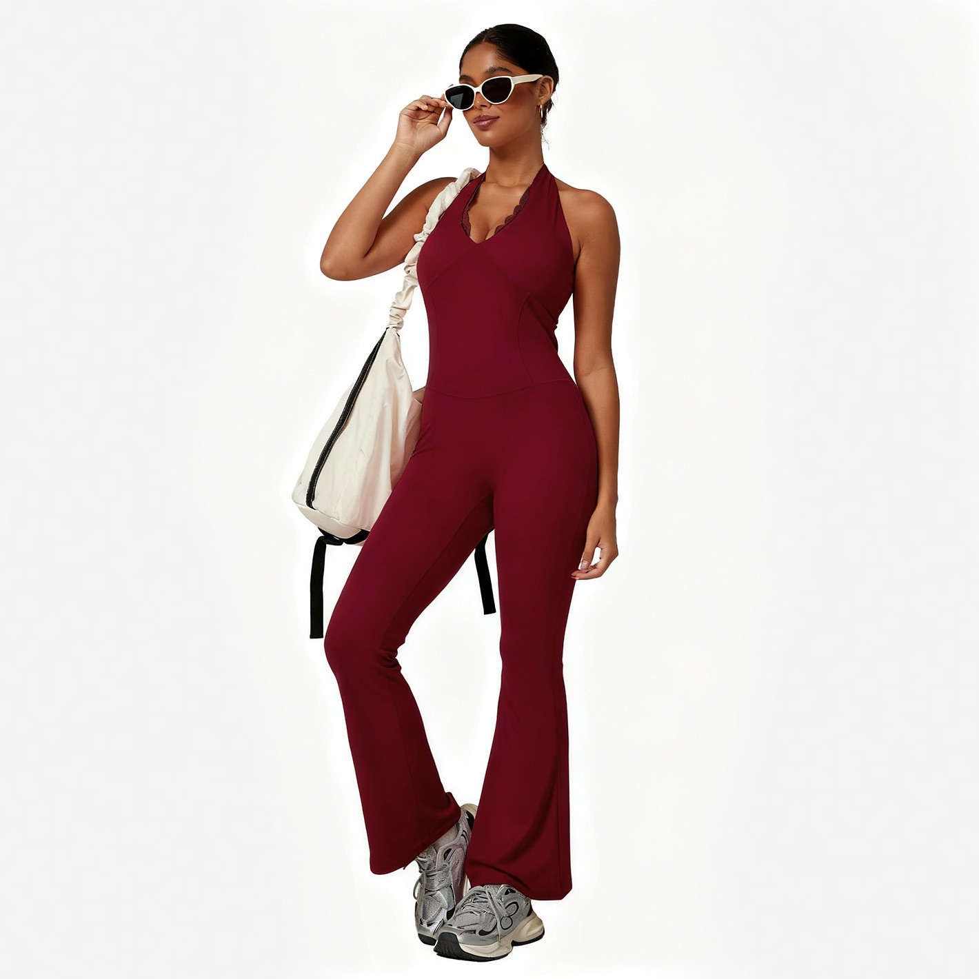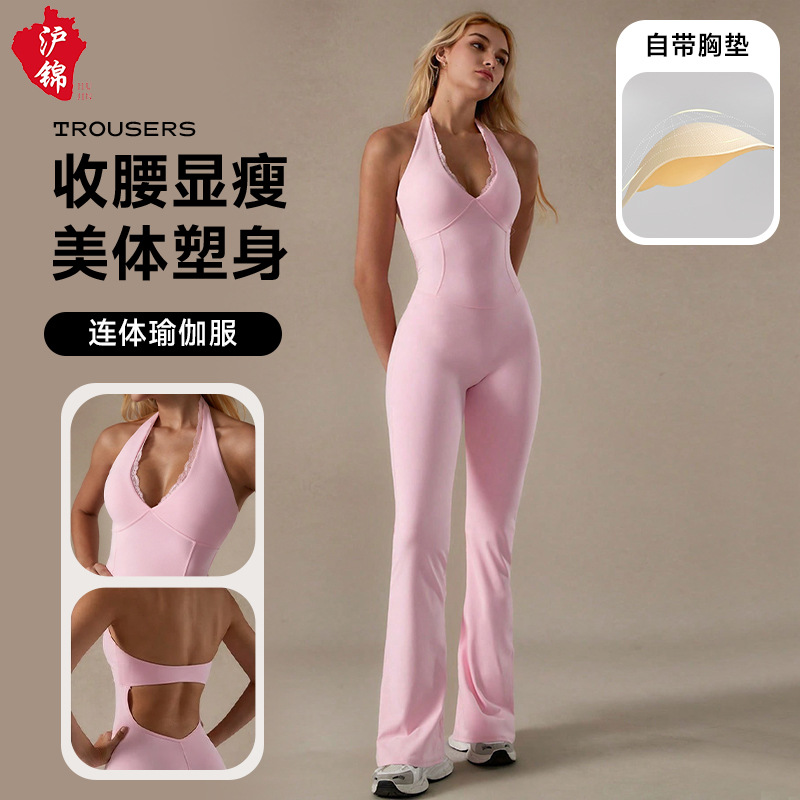Цельный комбинезон для йоги с кружевным V-образным вырезом, вставками для груди, красивым дизайном спины, эффектом подтяжки ягодиц и живота, с завязками на шее, длинными расклешенными брюками.